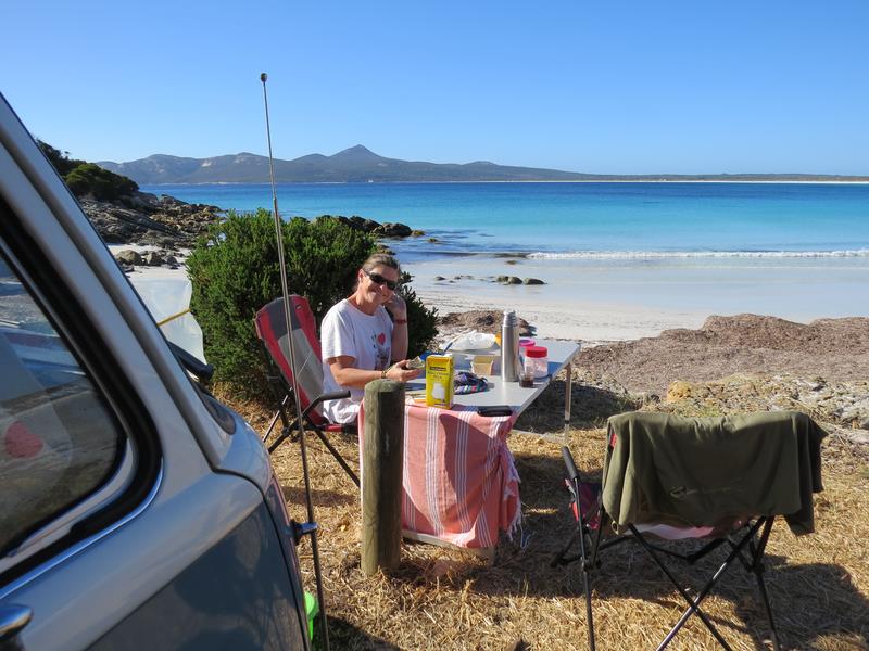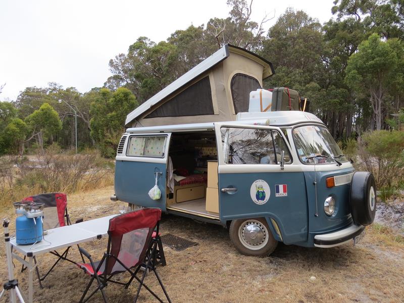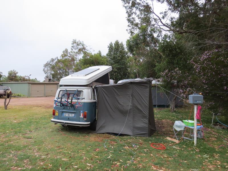 Esperance Nous nous installons dans le moins pire des caravan park que nous trouvons un peu en dehors de la ville. Les autres sont tous bondés, et les gens y sont les uns sur les autres. Nous avons quelques travaux de maintenance à effectuer. Mécanique, lessive, courses et surtout travail sur le site. Nous avons une météo horrible, nous essayons de nous protéger du vent et de la pluie comme nous pouvons. Transformation de notre kitchenette en cuisine américaine, nous pouvons cuisiner à l'intérieur maintenant !!! |