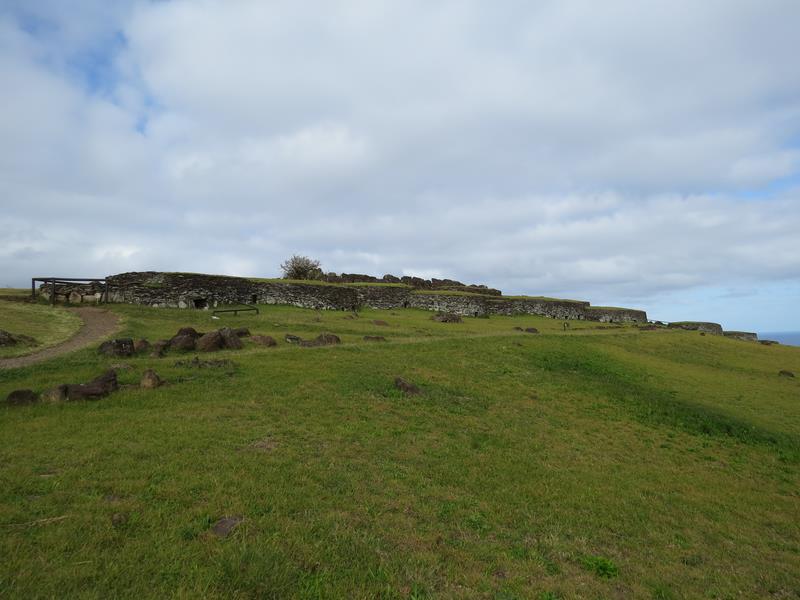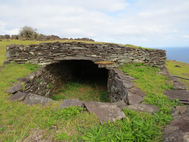 Ancien village d'Orongo Ce site n'était utilisé qu'au moment des cérémonies rituelles en l'honneur de l'Homme-Oiseau. Quelques maisons basses ont été restaurées. De forme elliptique, elles sont accessibles par une seule entrée latérale très très basse