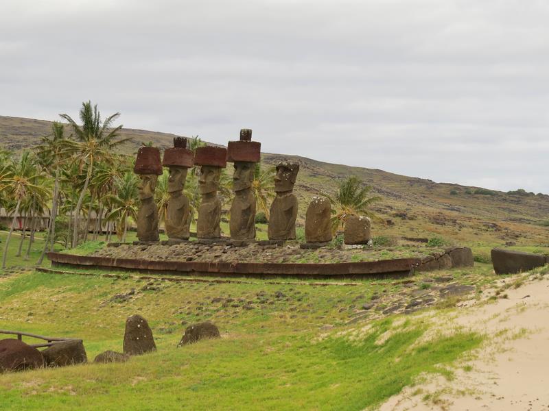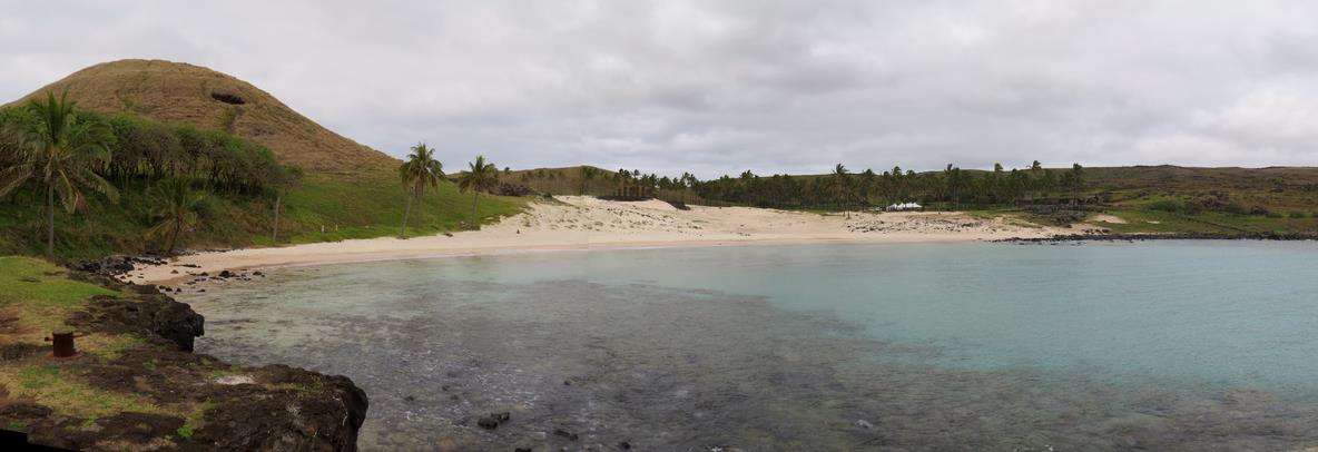 Playa de Anakena C'est "la" plage de l'île de Pâques avec sa mer aux eaux turquoises, son sable fin rosé qui borde la seule cocoteraie de l'île (plantée dans les années 60 et importée de Tahiti). On raconte que c'est ici que les premières embarcations Polynésiennes ont accosté pour coloniser l'ïle. Sur les 7 Moais présents, 5 sont intacts et 4 ont encore leur pukao. On peut aussi voir leurs longues oreilles