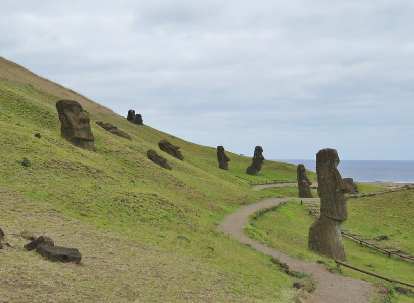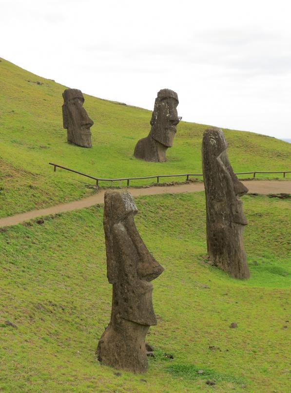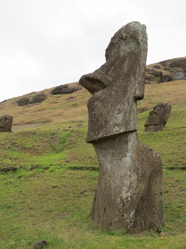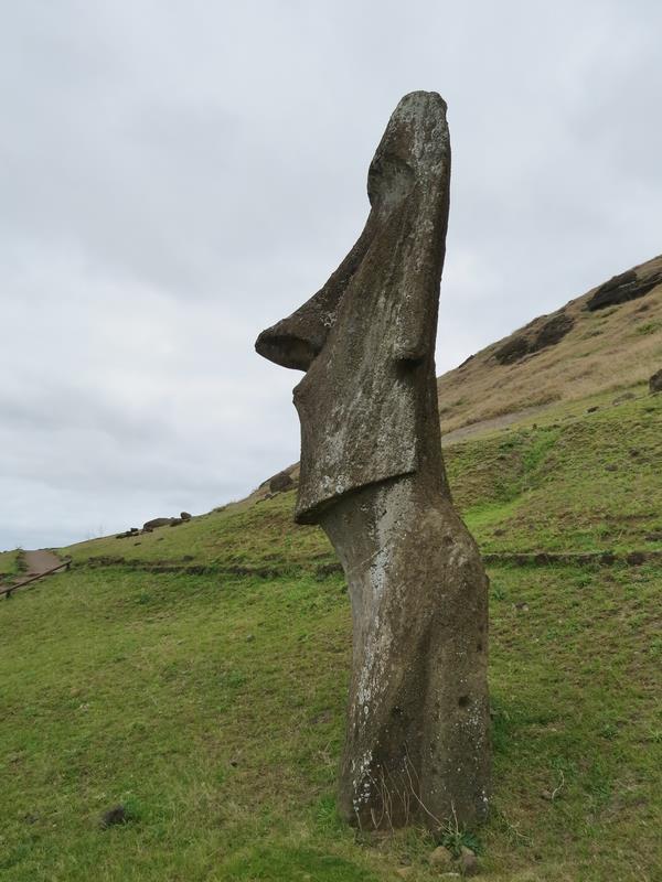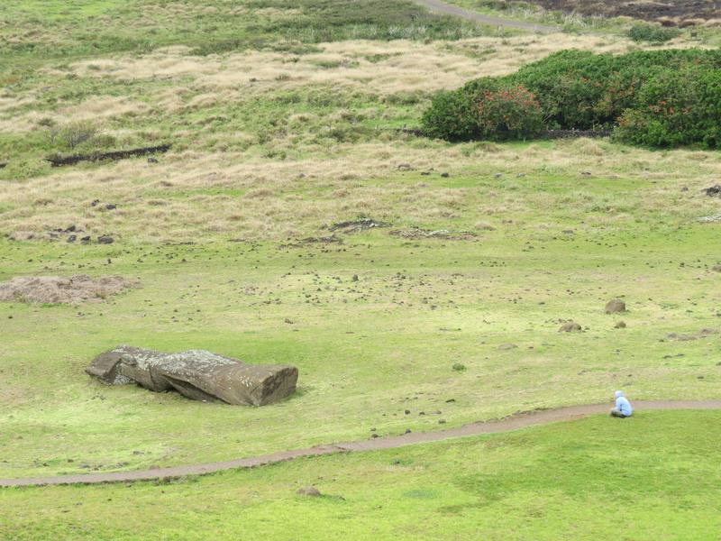 Rano Raraku C'est le volcan qui servit de carrière à la fabrication de 95% des Moais de l'île. 397 Moais en cours de construction ou de livraison gisent à même le sol, semi-ensevelis pour certains dont le plus grand Moai jamais sculpté : 21,60m - 200 t. C'est un peu bizarre, on est face à une image qui est restée figée dans le temps.