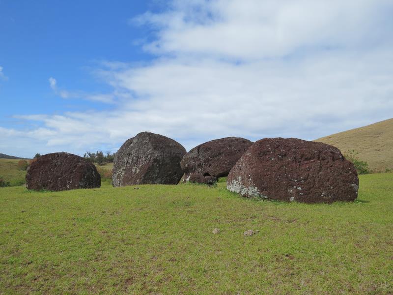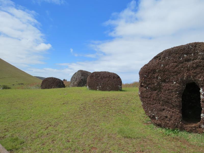 La carrière de Puna Pau C'est de ce cratère que l'on extrayait la scorie ou tuf, roche rouge utilisée pour la fabrication des pukaos. Les pukaos perdaient un tiers de leur volume par simple frottement durant leur transport jusqu'au site final où ils étaient amenés en les faisant rouler, jusqu'à 20kms... Ils étaient ensuite retaillés juste à coté des Moais sur lesquels ils allaient être fixés.