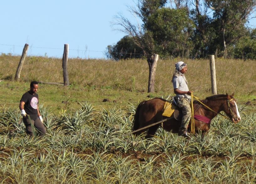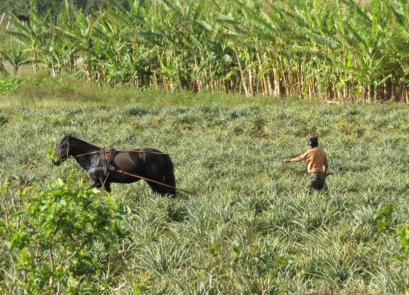 Les chevaux servent encore de nos jours au labour (ici des champs d'ananas)