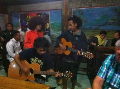 Arrêt à Moni. La soirée s'annonçait tristounette car sous la pluie, mais finalement nous rencontrons un couple de Belges qui s'installe à notre table avec qui nous avons bien rigolé. Alexis notre chauffeur arrive avec sa guitare et celle de Fernando. Soirée musique improvisée