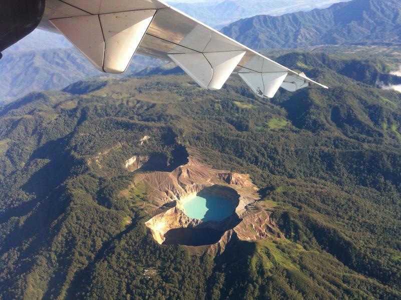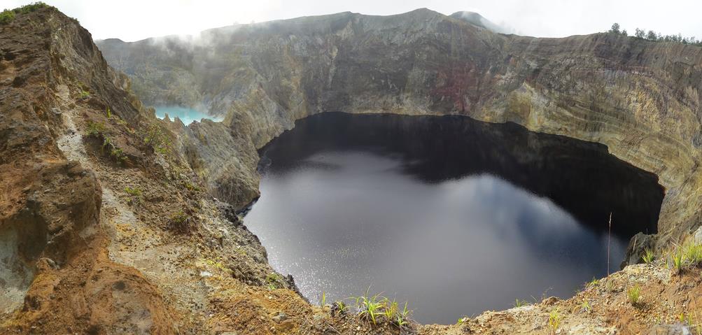 On y va ou on y va pas, that is the question ????? le temps est toujours aussi pourri, aucune visibilité, le volcan est dans les nuages ........ Alexis se renseigne et décide que nous devrions y aller, car il y aurait une fenêtre météo favorable et le sommet serait dégagé. Nous sommes très sceptiques mais c'est lui le guide. D'autant plus que jusqu'à moins d'un kilomètre du sommet c'est toujours Londres en Décembre, mais arrivés en haut c'est complètement dégagé. Les 3 lacs multicolores situés en haut du volcan Kelimutu sont le résultat d'une anomalie géologique. Bien que très proches les uns des autres, les lacs changent périodiquement et indépendamment de couleur. Ceci est dû aux sédiments. Le lieu est sacré pour les locaux. Ces derniers pensent même que les lacs abritent des esprits. Et à chacun son lac ! Le premier lac est nommé Tiwu Ata Mbupu. C'est le lac des âmes des ancêtres. Le second lac est nommé Tiwu Nuwa Muri Koo Fai. Ce lac abrite les âmes des plus jeunes. Le troisième lac est appelé Tiwu Ata Polo. C'est le lac le plus sombre et le plus mystérieux. C'est le rendez-vous des mauvais esprits. Les deux premiers lacs sont proches l'un de l'autre et de couleurs vert-bleu. Le 3ème lac, le plus sombre, est un petit peu plus éloigné.