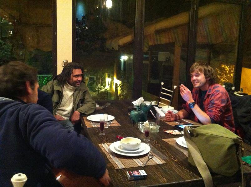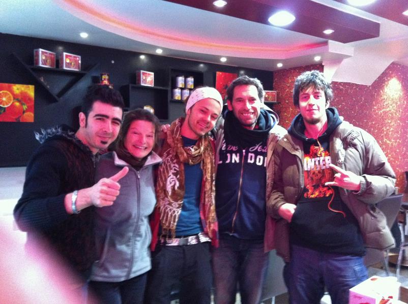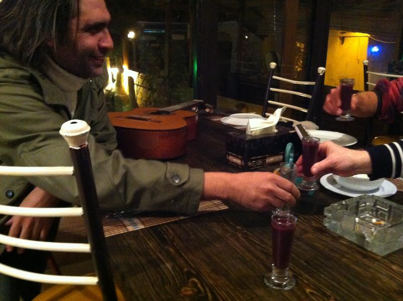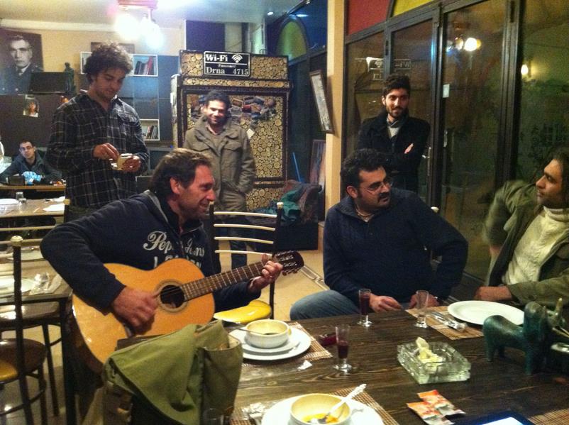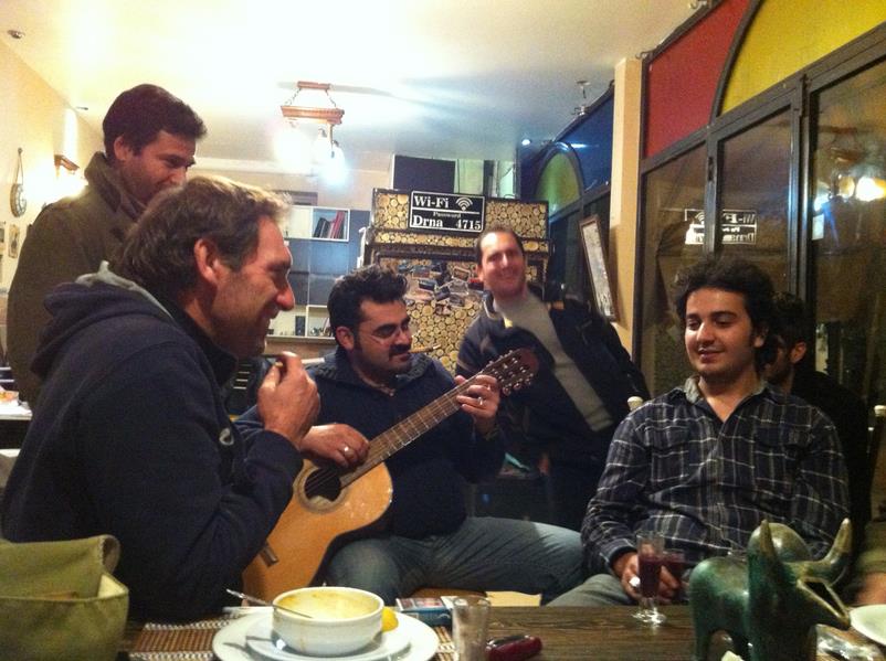 Il est déjà tard et décidons de nous arrêter à Maku où nous savons qu'il y a un hôtel. Après avoir tourné pas mal de temps dans Maku, nous finissons par trouver le Maku Inn hôtel. Nous décidons d'aller à la découverte des iraniens et trouvons un petit restaurant qui a l'air bien sympa. Ce restaurant est tenu par de jeunes iraniens effectivement très sympathiques. Des amis du patron arrivent un peu plus tard et c'est alors qu'ils nous demandent si nous voulons boire du vin qu'il produit. Face à nos remarques d'étonnement, il nous répond dans un anglais parfait par un magistral "Fuck the police"!!! Nous acceptons bien entendu de trinquer avec ces gars là, qui s'avèrent être tous des opposants aux gouvernements politique et religieux du pays. Un autre gars dit à Sabine qu'elle peut retirer son voile !!!! et l'accompagne bien entendu d'un autre superbe "fuck the police" ! Le patron sort alors sa guitare et demande à Fernando de chanter des chansons françaises de Lara Fabian, Dalida, Jacques Brel, Adamo et SHEILA. Les personnes qui nous connaissent, savent bien évidemment que Fernando connaît par coeur le répertoire de Sheila et Adamo ...!!!! Quelle culture musicale française tout de même chez ces iraniens !!! Nous passons une super soirée, mais totalement surréaliste !!!!