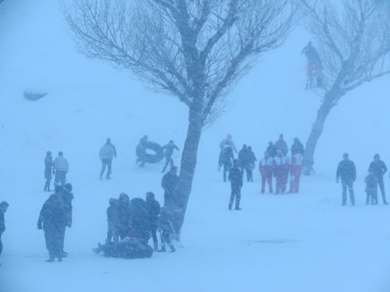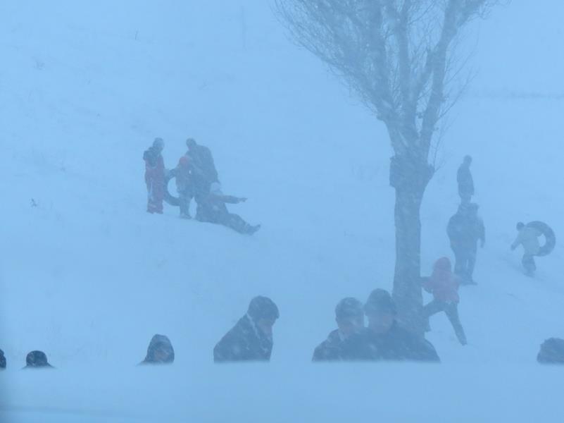 Sur le bord de la route, nous voyons plein de voitures stationnées. Au début, nous nous demandons s'il n'y a pas un accident. Mais non, c'est juste un rassemblement de "lugeurs" sur des pistes de luge improvisées. Ils utilisent des pneus en guise de luge.