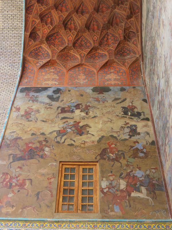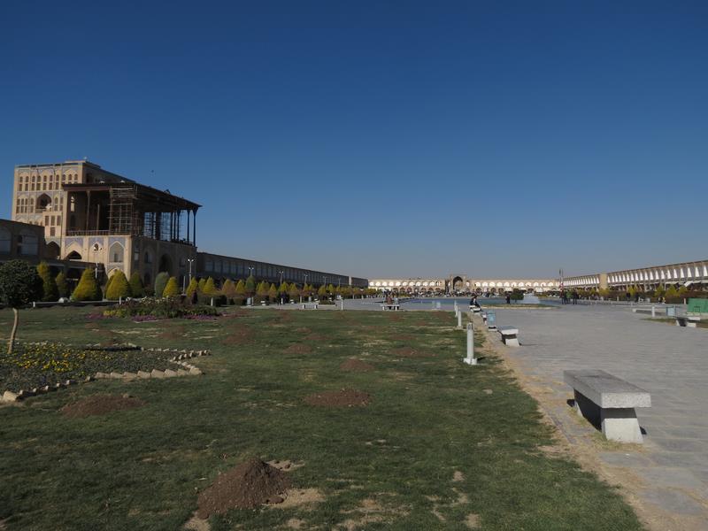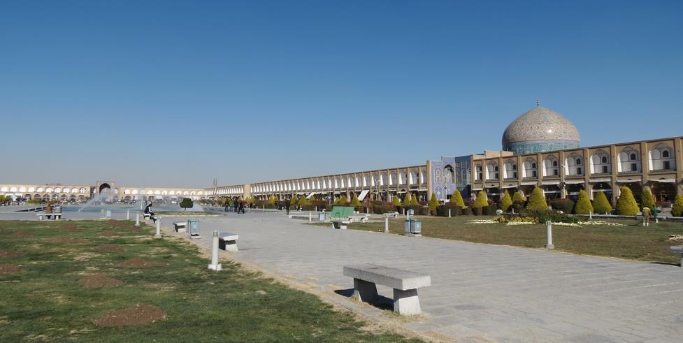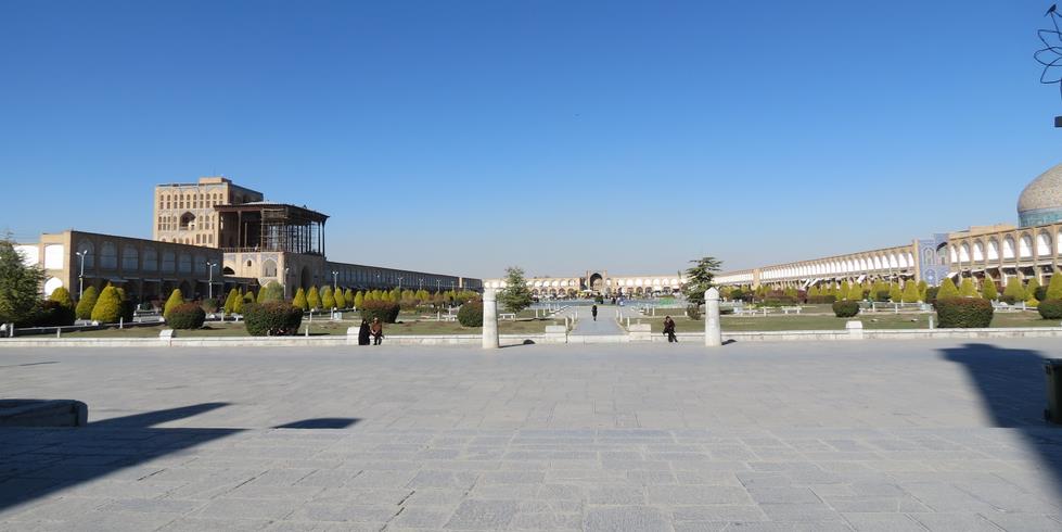 Cette place impressionnante à une longueur de 512m sur 160m de large, et est entourée de bâtiments avec des arcades sur deux niveaux. Quatre monuments se trouvent autour de cette place : la mosquée Imam, l'entrée du grand bazar, la mosquée Cheikh Lotfollah et le palais Ali Qapu. La place servait aux célébrations, aux fêtes et, il y très longtemps ... aux grands tournois de polo. D'ailleurs, les poteaux de but en pierre existent toujours. Actuellement la grande prière du vendredi à toujours lieu sur cette place.