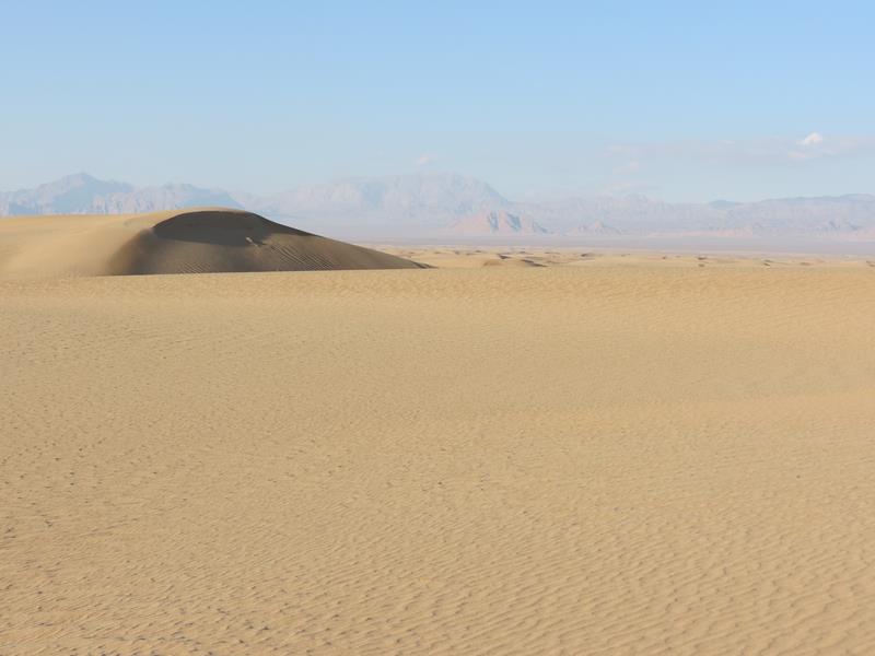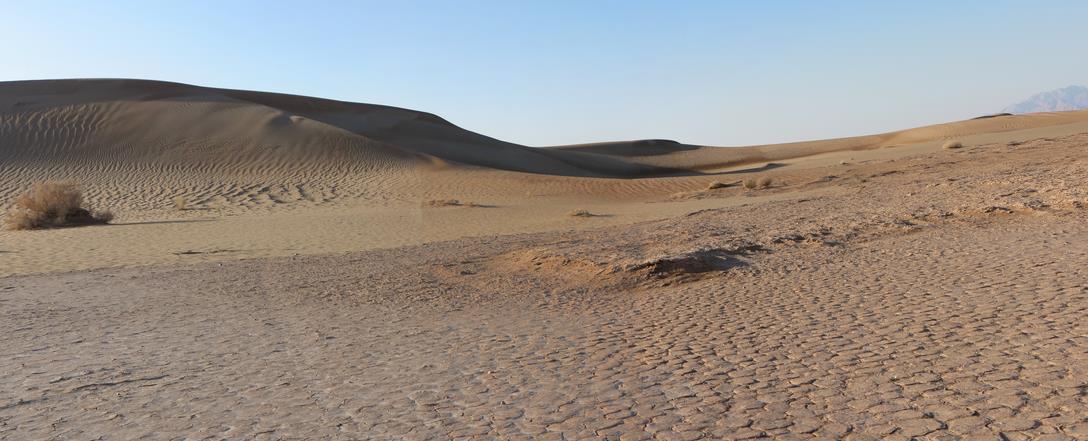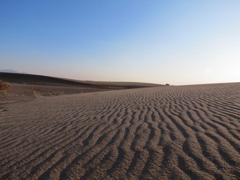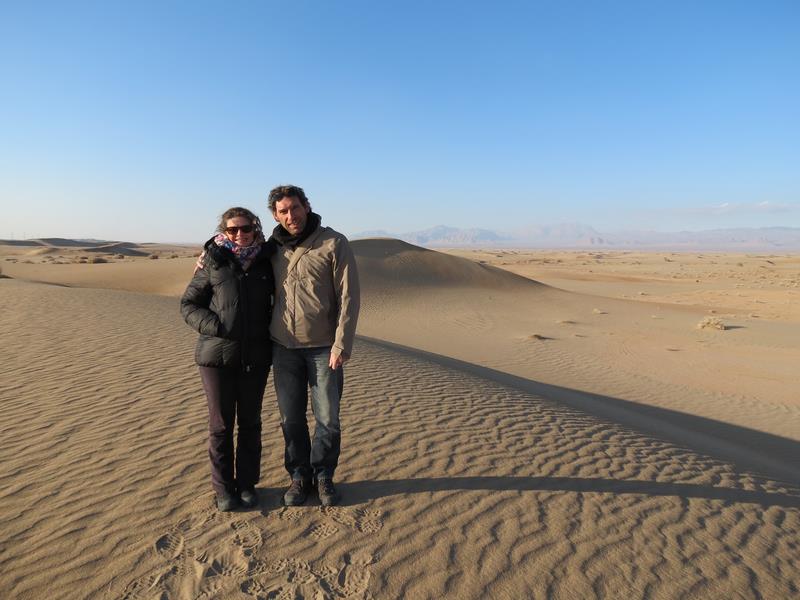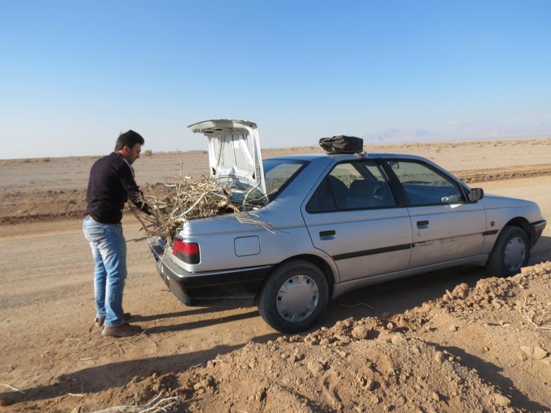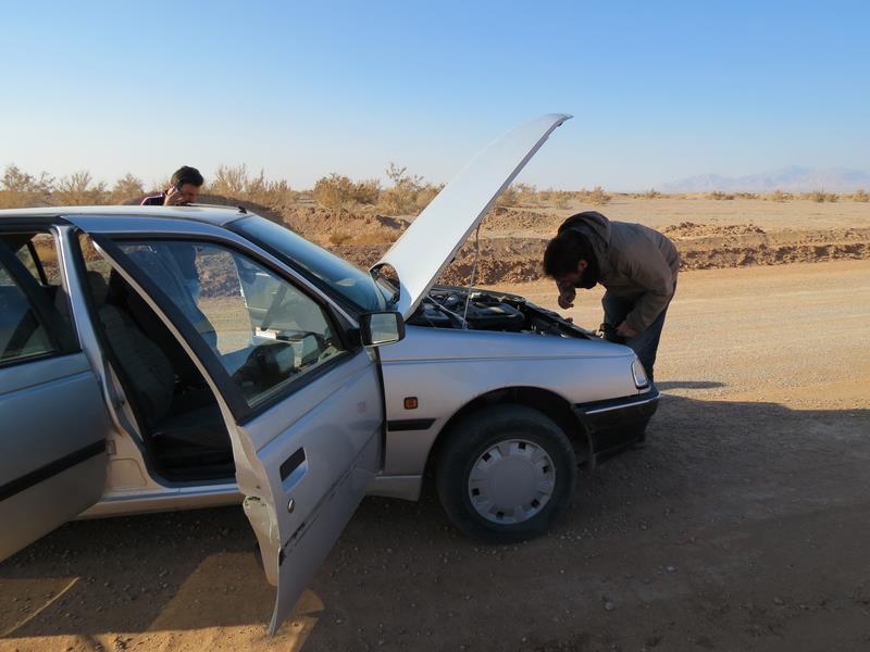 Après être partis de la guesthouse, nous faisons un 1er arrêt pour ramasser du bois mort en prévision d'un feu de camp. Quelques minutes après celà, la voiture tombe en panne. Verdict : courroie d'alternateur cassée. On décharge le bois... Massoud appelle un taxi qui va nous amener dans le désert où nous rejoignons Ali, arrivé sur place en moto par un autre chemin et qui a déjà préparé un feu. Nous faisons une marche de 3h dans le désert. Les paysages sont magnifiques. Nous n'imaginions pas un désert dans cette partie de l'Iran et nous ne regrettons pas d'avoir fait le détour. Nous apprécions d'autant plus cette balade du fait que jusqu'à maintenant nous n'avions pas pu profiter pleinement des magnifiques paysages que nous offre l'Iran. Après la balade, nous nous retrouvons tous autour du feu. Ali nous a préparé du thé, des pommes de terre et des navets cuits à la braise et Massoud nous chante des chansons traditionnelles.