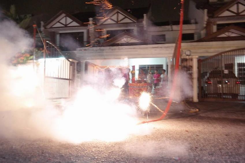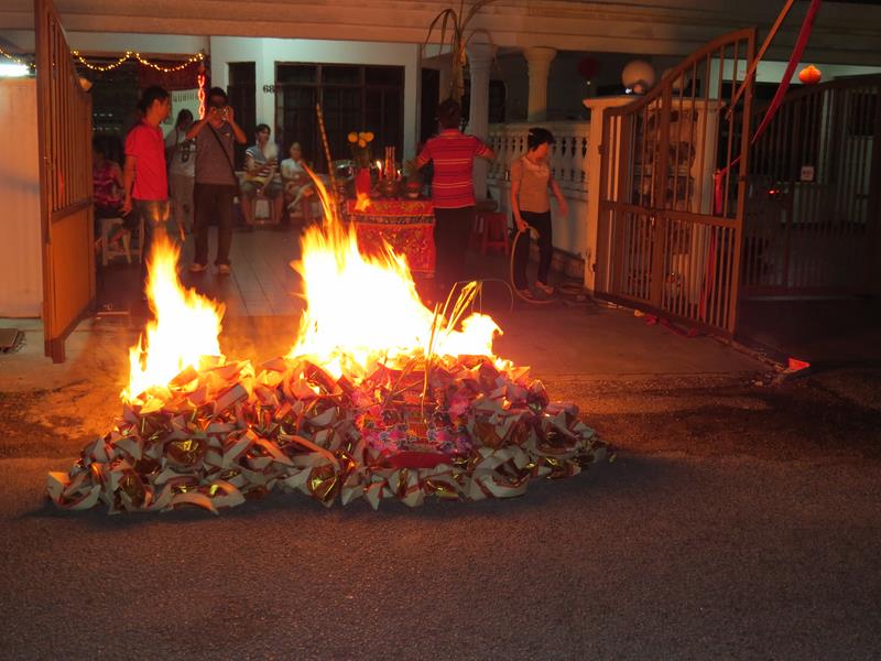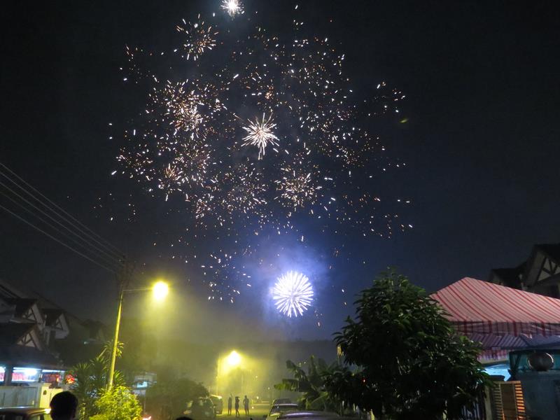 Spectacle Spécial Nouvel An dans la rue : une montagne de papiers en forme de petits bateaux qui sont enflammés, des rubans de pétards et des feux d'artifices. Et c'est comme ça devant quasiment chaque maison...
