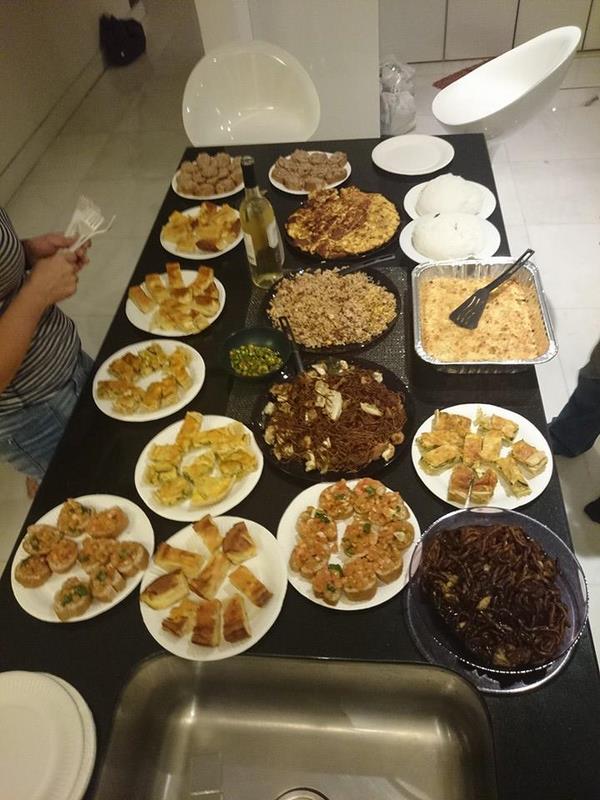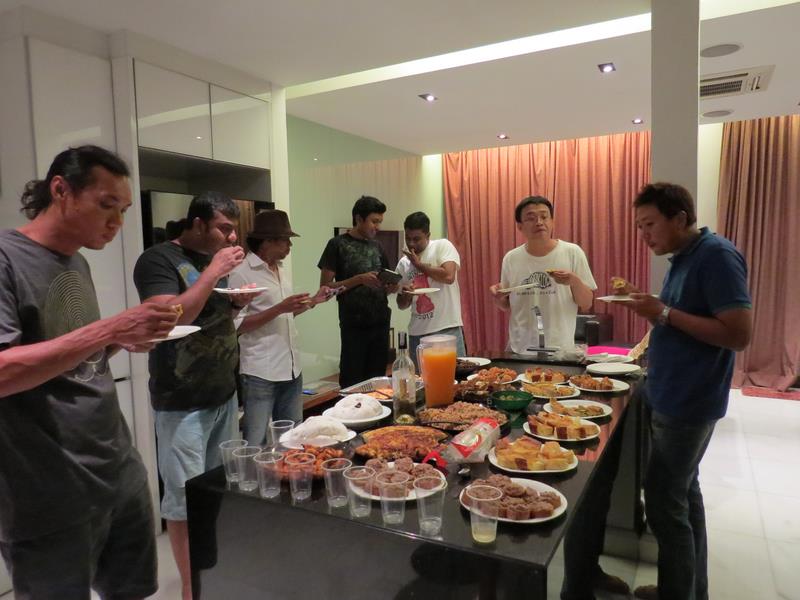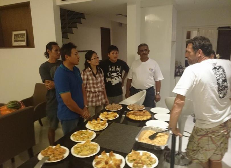 Avant de partir pour Bangkok (BKK) nous devons nous mettre au fourneau pour préparer de la cuisine française à toute cette bande. Au secours !!! Primo établir le menu qui n'est pas une mince affaire car nous ne savons pas exactement combien nous serons, donc option buffet : quiche aux légumes, bruschettas à la tomate, tartines de pâté de campagne français (nous en avions dans un coin pour les coups de blues), gambas à la portugaise, omelette à la tomate et aux lardons, émincés de poulet aux champignons avec purée faite maison, clafoutis aux poires et crumble aux pommes !!! Rien que ça... Ils devaient avoir peur de nos aptitudes culinaires car ils sont tous venus avec plein de victuailles asiatiques. Conclusion, nous n'arrivons pas à tout manger !!!!!