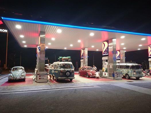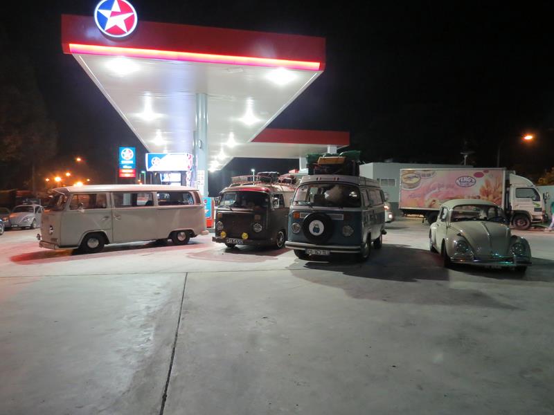 Nous les retrouvons sur une station d'autoroute, nous serons 4 combis et 4 cox. Et nous voilà partis pour 1600 kms environ. Il est déjà plus de minuit et nous allons rouler toute la nuit jusqu'au petit matin et faire alors une pause dodo de 1h et demi. Fernando se fait réveiller par un des gars car notre radiateur fuit, la tuile !!!!. Ca ne serait pas arrivé avec un aircooled...