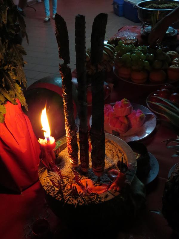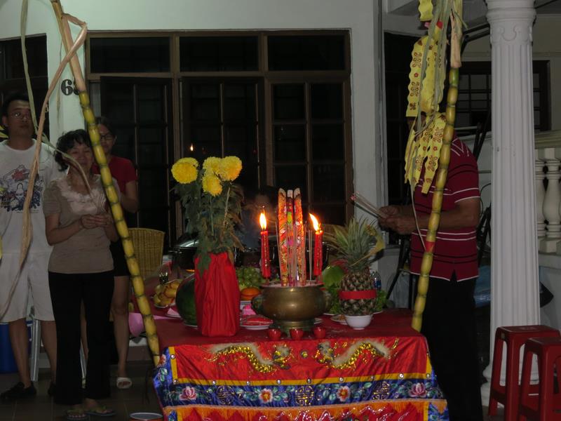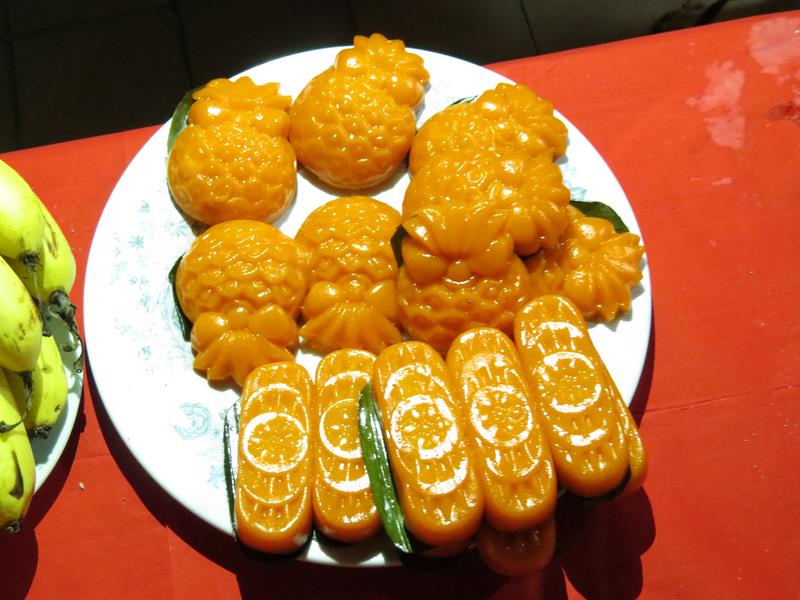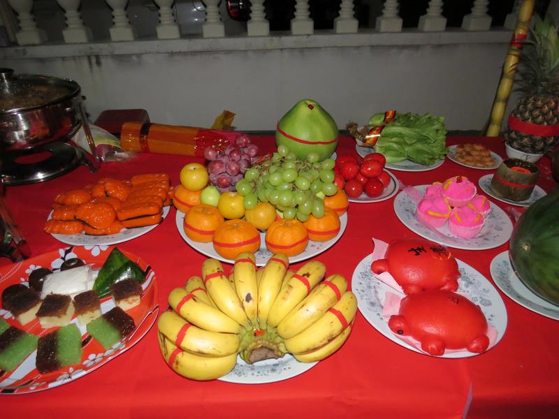 Le nouvel an chinois. Le buffet des offrandes, et leur symbolique : les oranges représentent la richesse le raisin représente l'abondance l'ananas représente l'appel à la chance le pamplemousse représente la fertilité la laitue représente la vie l'oeuf représente la prospérité les bambous représentent la longévité... enfin c'est ce qu'il nous semble avoir compris...