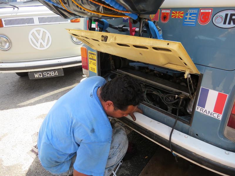 Nous sommes à coté d'une ville où justement nous devons retrouver d'autres amis VW. Ils nous amènent chez un réparateur de radiateurs. Voyant que l'attente s'éternise, nous leur proposons de partir et de les rejoindre au prochain point de chute, et ben NON leur devise "nous restons ensemble jusqu'au bout" .