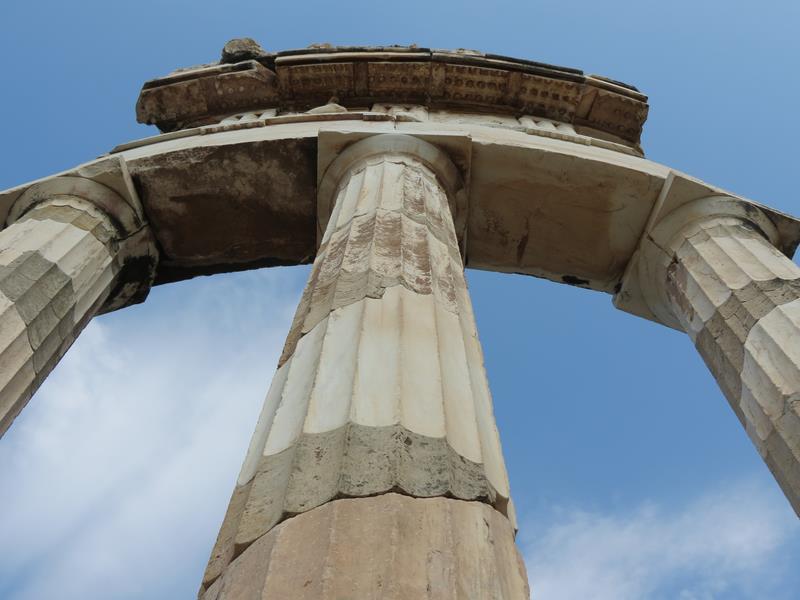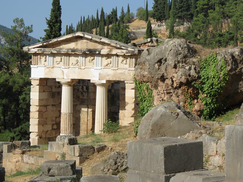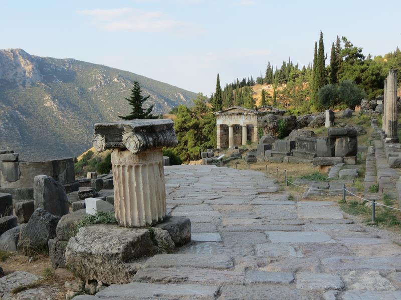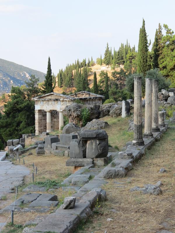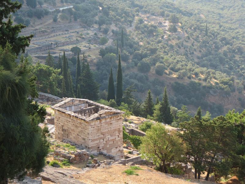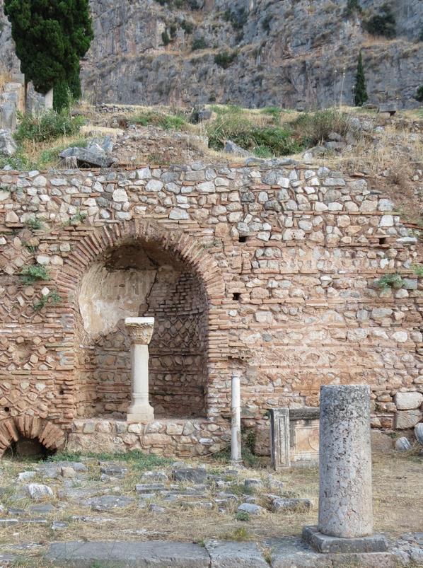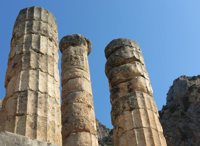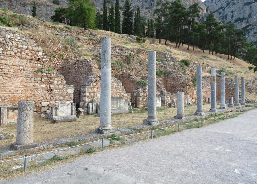 | | DELPHES Selon la légende, lorsque Zeus lâcha deux aigles aux deux extrémités du monde, leurs trajectoires se croisèrent au-dessus de Delphes, marquant ainsi le centre du monde. C'est à cet endroit que fut construit le sanctuaire d'Apollon.