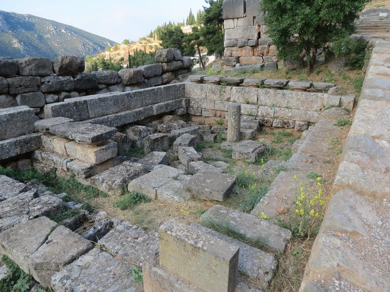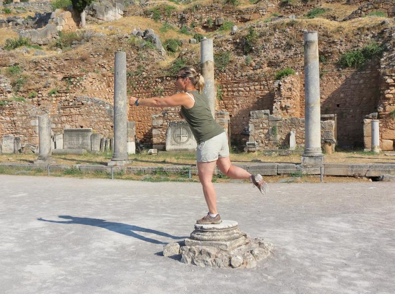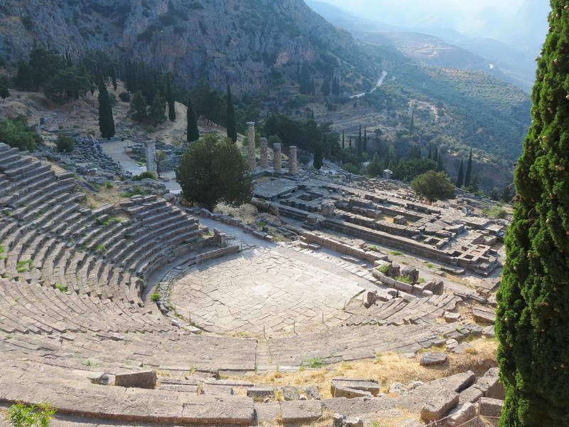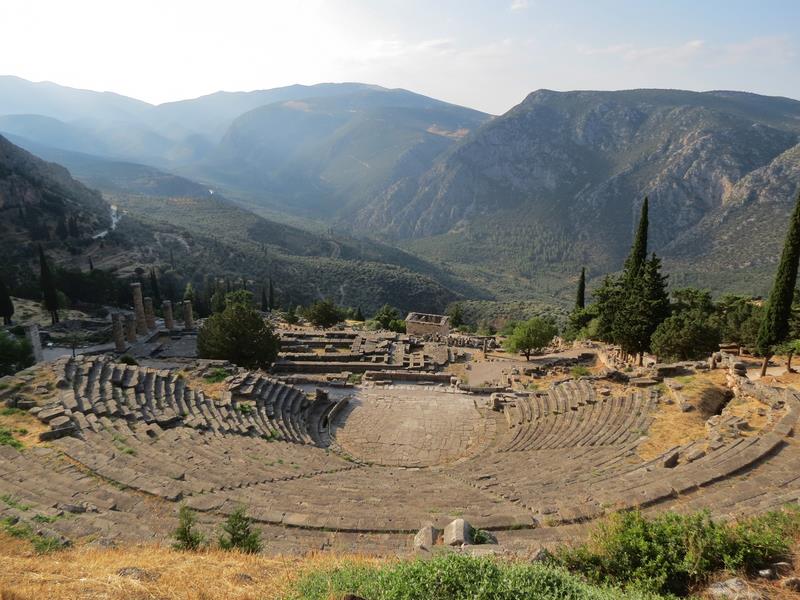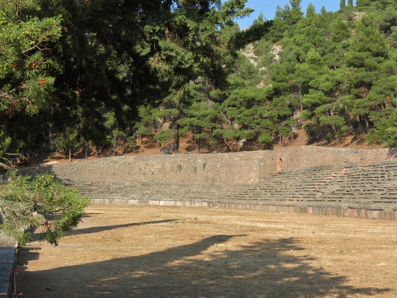Le stade de Delphes est l'un des mieux conservés de Grèce. Long de 200 m, il accueillait, tous les 4 ans à partir de 582 av. J.C. les 7000 spectateurs conviés aux Concours pythiques. Ceux ci constituaient le prolongement sportif des fêtes musicales, incluant concours poétiques et musicaux, qui étaient organisés tous les 8 ans dans le théâtre (dans lequel Sabine s'est essayée au chant !!), pour commémorer la victoire d'Apollon sur le serpent Python. Ils étaient avec les jeux Olympiques le principal événement sportif du calendrier grec antique. Les vainqueurs des épreuves d'athlétisme, qui constituaient l'essentiel de ces concours pythiques, recevaient des trophées honorifiques : une couronne de laurier et le droit de se faire édifier une statue dans le sanctuaire.