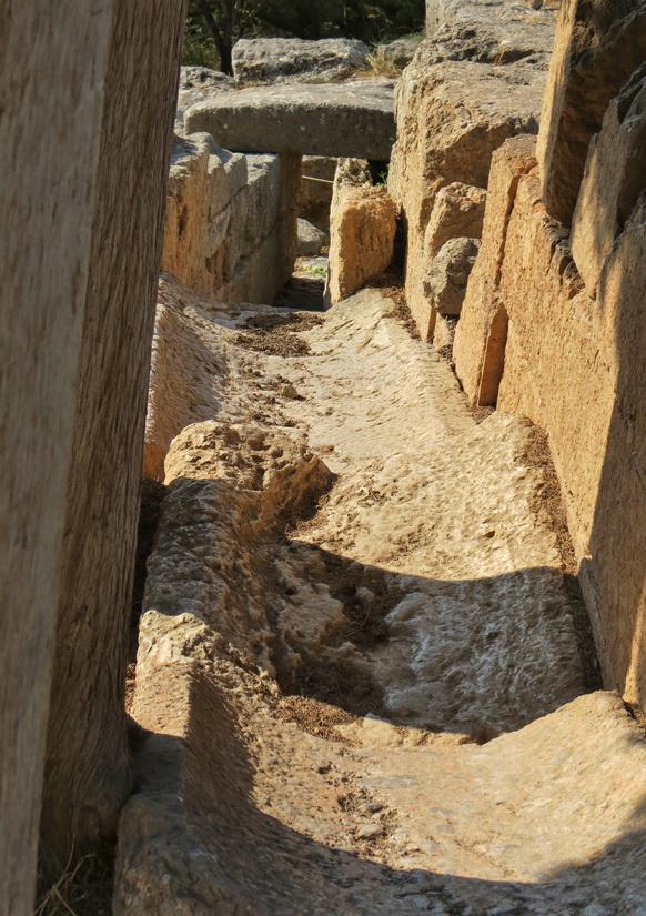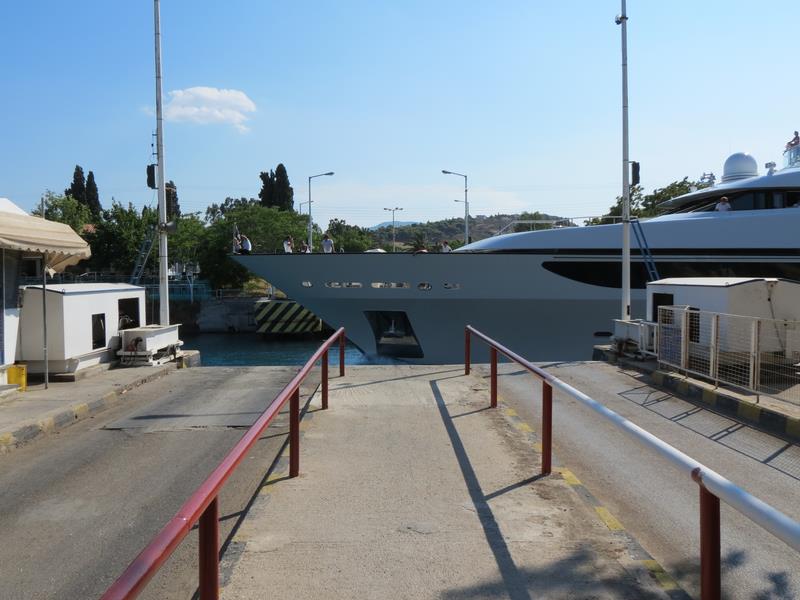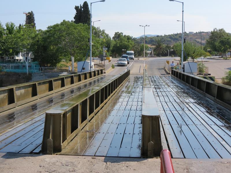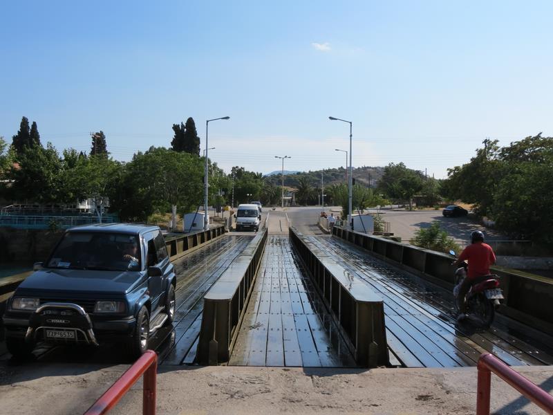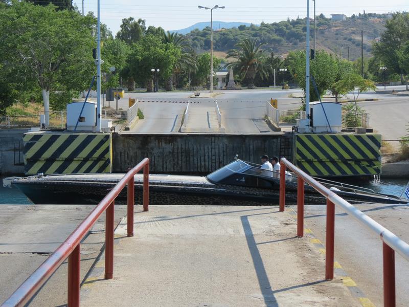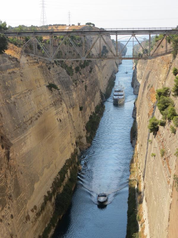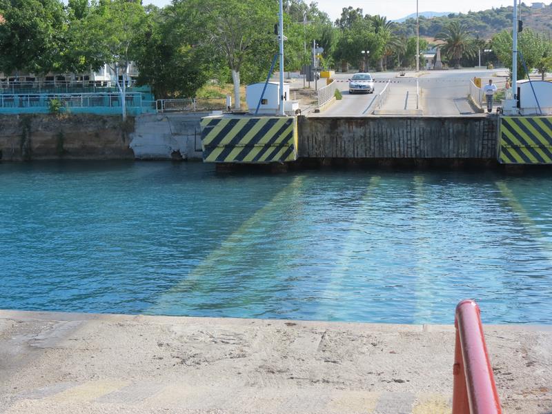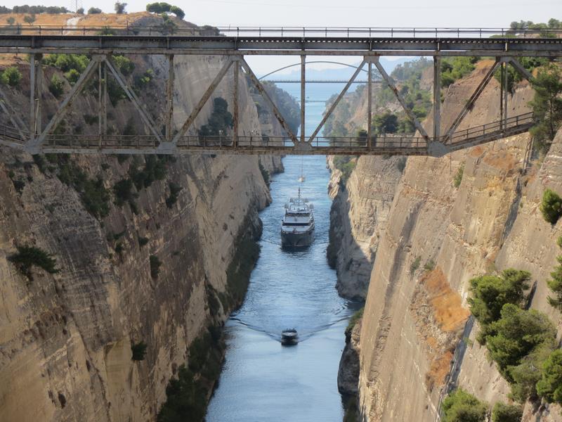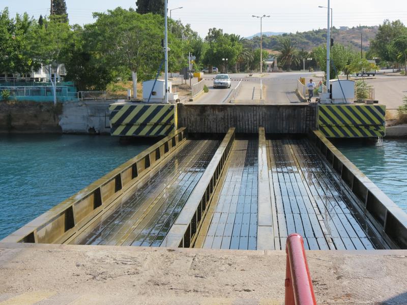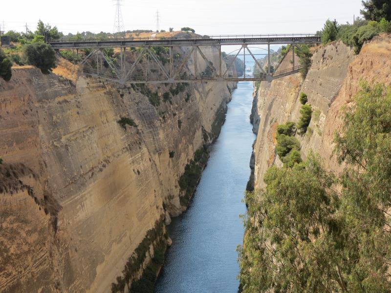 Passage par le canal de Corinthe. Impressionnant canal imaginé depuis l'époque de Néron, mais réalisé seulement en 1893. Un pont vertigineux surplombant le canal en son milieu et un autre pont submersible..., permettent aux voitures de franchir ce "canyon" créé par l'homme