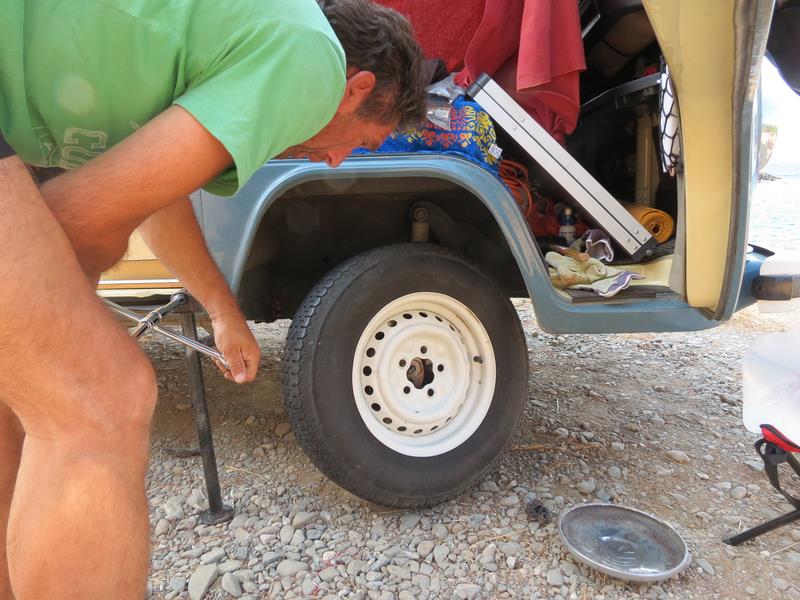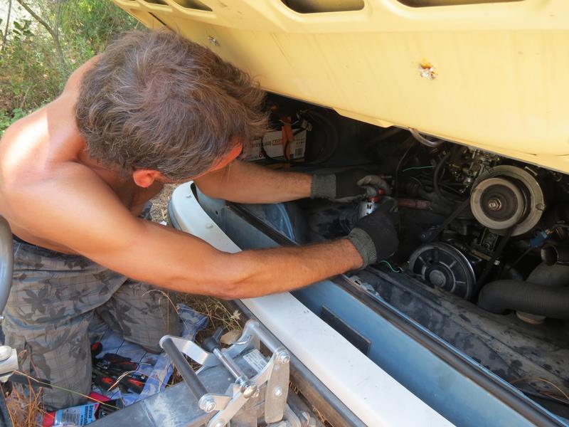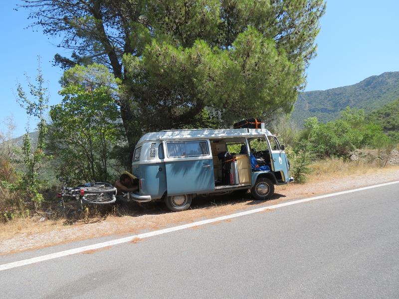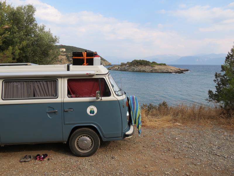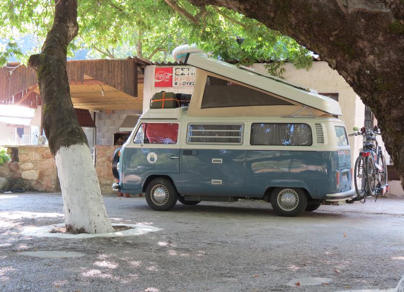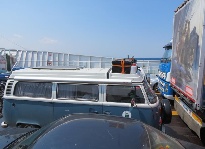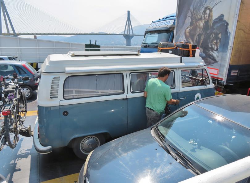 Nous partons en direction du Péloponnèse et nous prenons le ferry pour Patras. Arrivés dans les montagnes du Péloponnèse nous rencontrons de petits soucis mécaniques. Après réparation, Caracolito repart avec un joyeux et rassurant ronronnement, mais Fernando n'étant pas très confiant sur ses compétences de mécanicien, nous décidons de bifurquer vers l'est en direction d'Athènes, pour aller voir CS Beetle que nous avait recommandé Sebastien et Soizic (rencontrés aux Météores). Nous nous arrêtons pour la nuit sur le parking d'une taverne