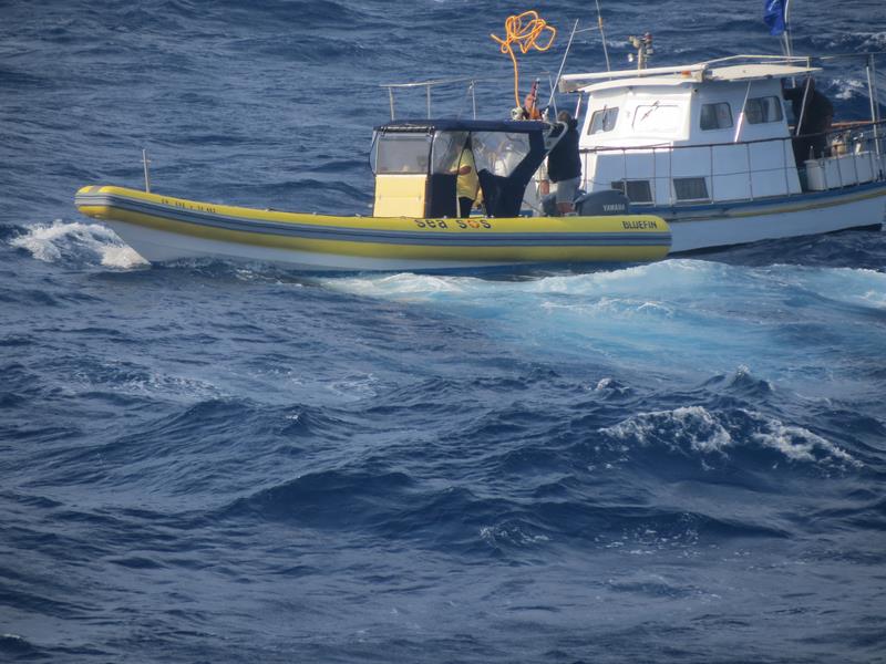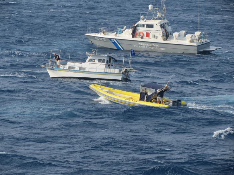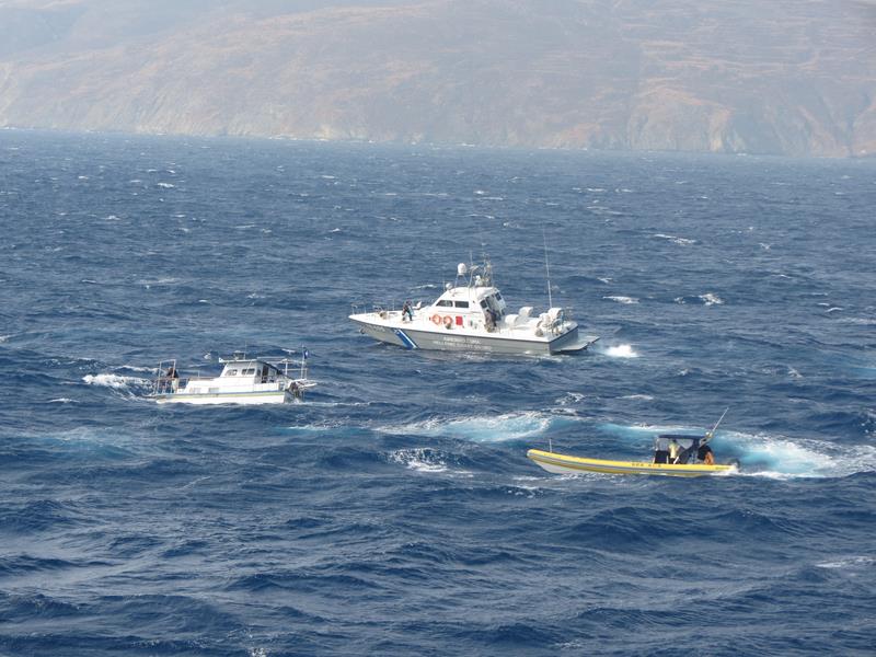Nous prenons le ferry au Pirée pour aller à SANTORIN. En chemin notre navire se déroute pour aller porter secours à un petit bateau de pêche en détresse. Un bateau des gardes-côtes est déjà sur place. Un porte-container et un autre navire marchand arriveront par la suite. Un canot léger des gardes-côtes arrive enfin à approcher la frêle coquille de noix chahutée par la mer et à lui lancer un filin qui permettra de le remorquer. Un sauvetage en mer impressionnant.