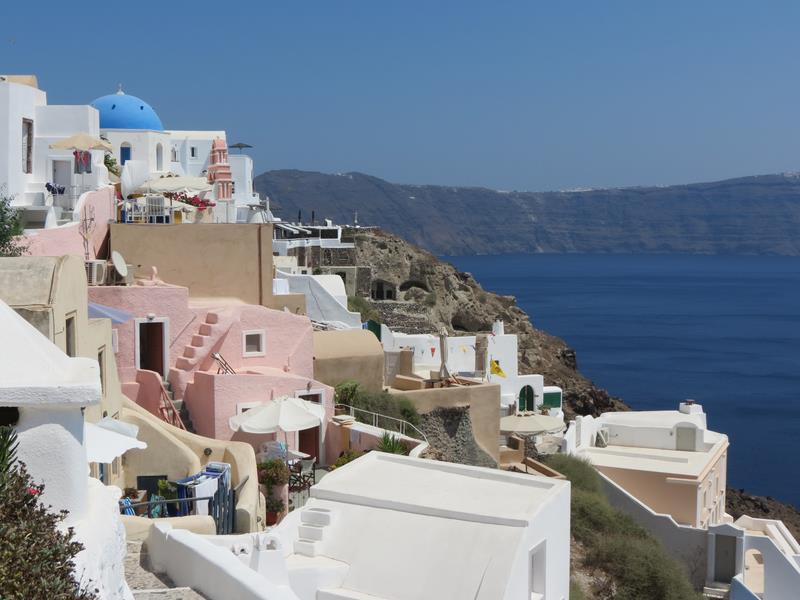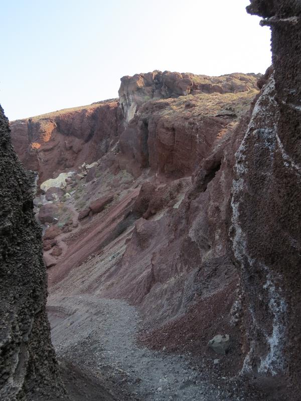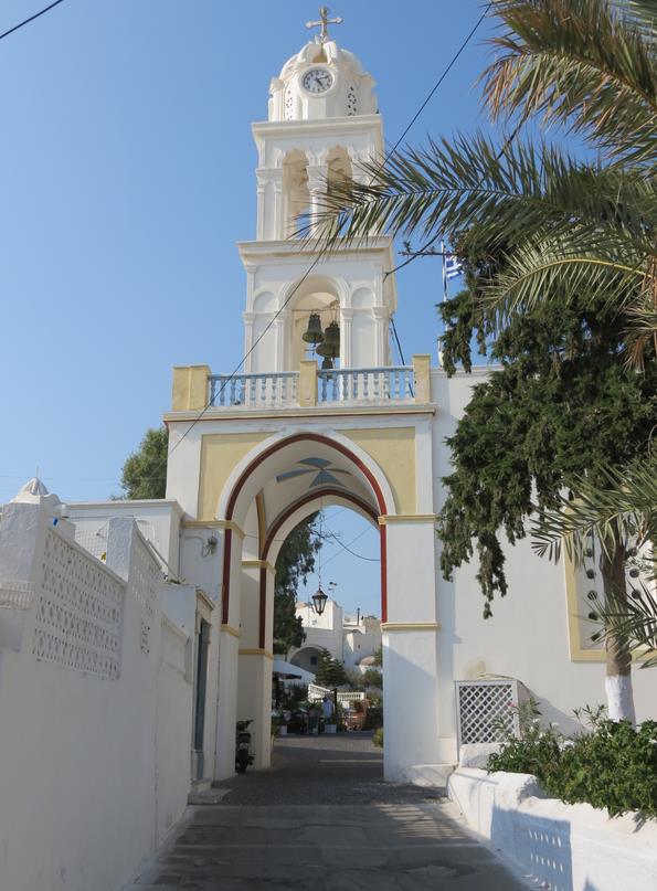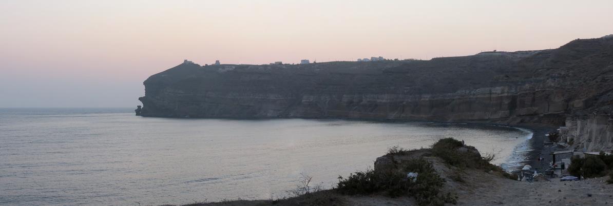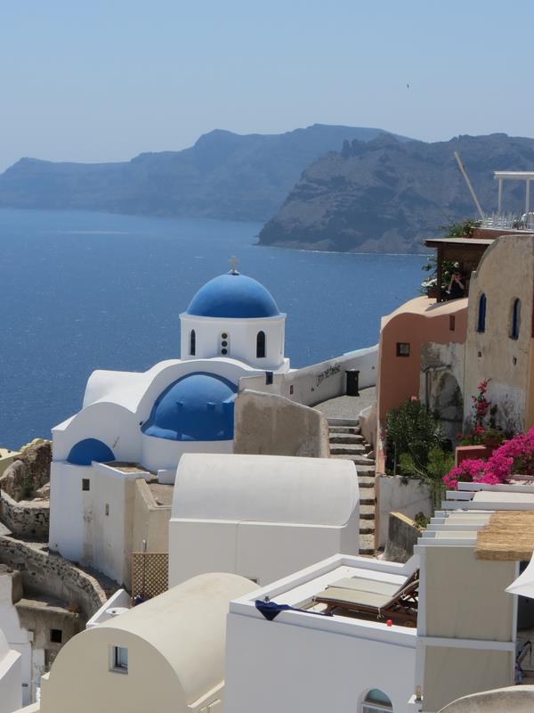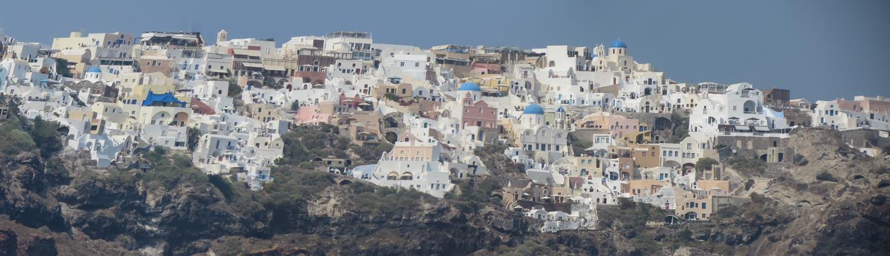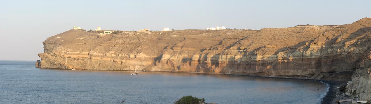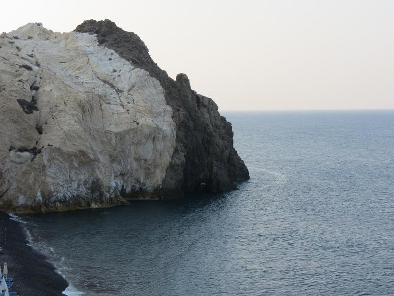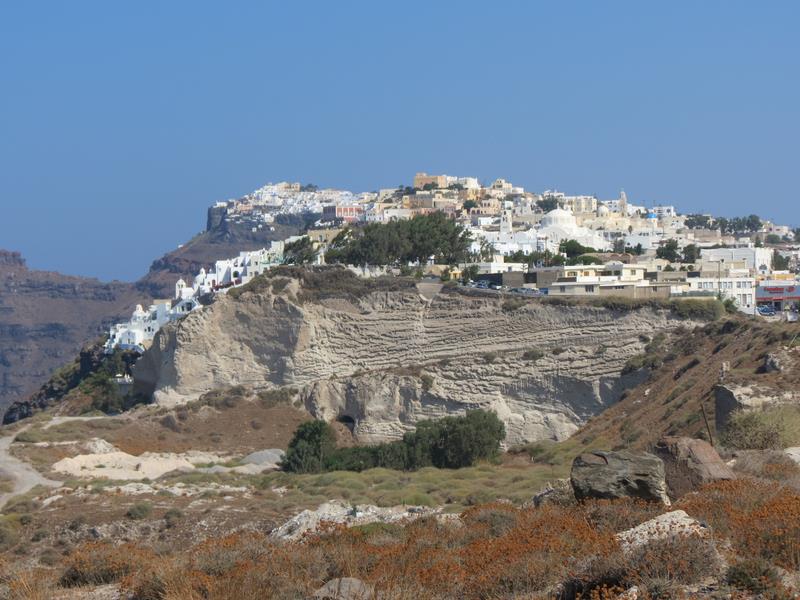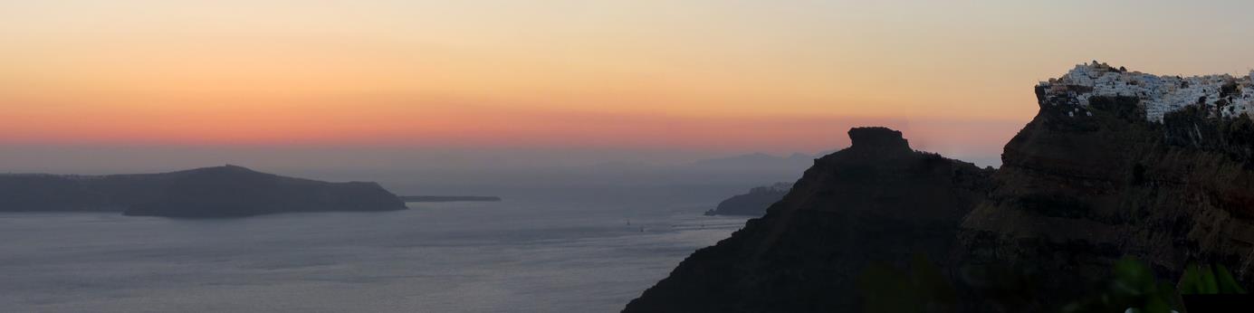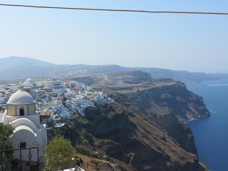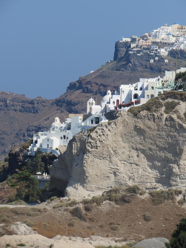 Arrivée à l'île de Santorin La tour Eiffel de la Grèce !!! Santorin offre l'un des spectacles naturels les plus saisissants de la Méditerranée : imaginez une île/volcan dont le cratère s'est totalement effondré ne laissant à la surface de l'eau qu'une partie de la ceinture du volcan, quelques îlots et au centre de tout ça une petite île faite de lave d'où sortent des sources chaudes formant ainsi la Caldeira. C'est étrange cela veut dire "chaudière" en portugais ... Santorin offre l'image d'une longue falaise en à-pic de 80 à 120 m de haut, où se superposent des couches géologiques de cendres noires ou rouges, avec des villages blancs perchés aux sommets. C'est magnifique !