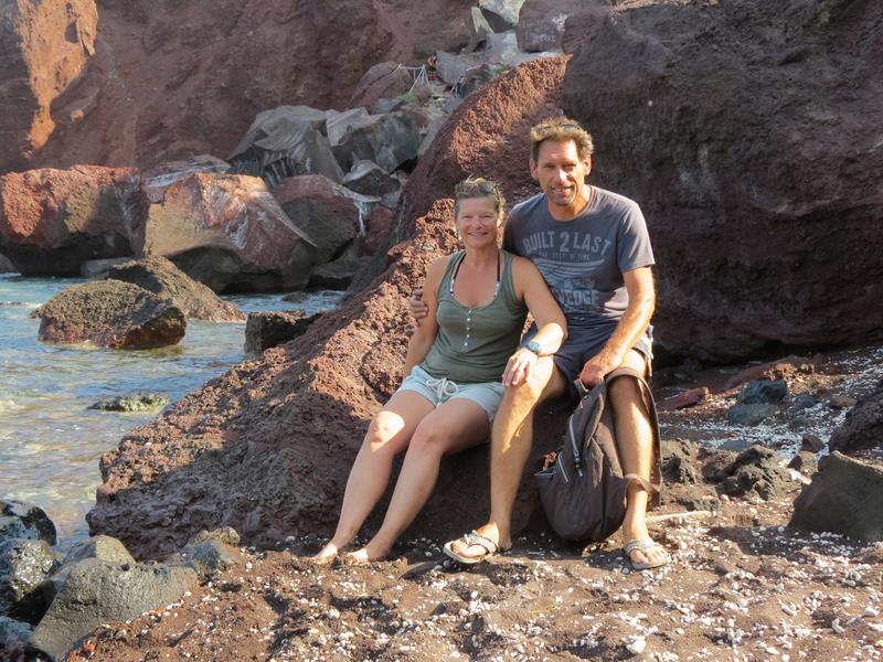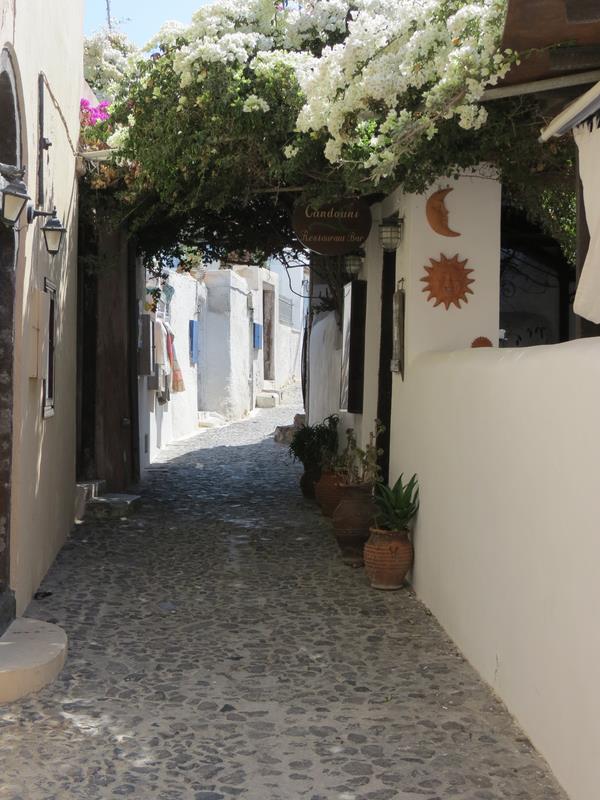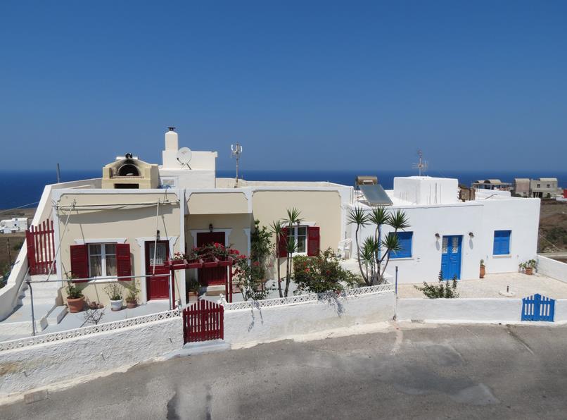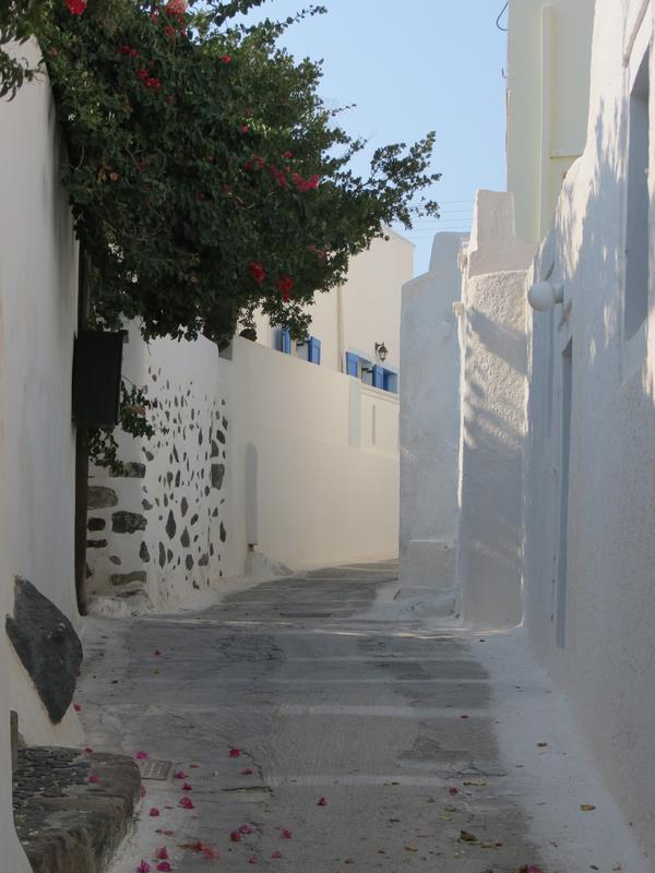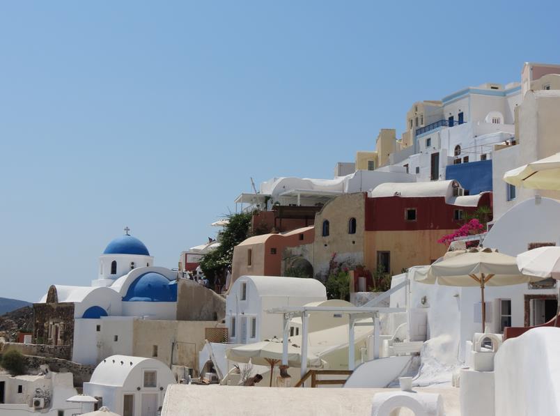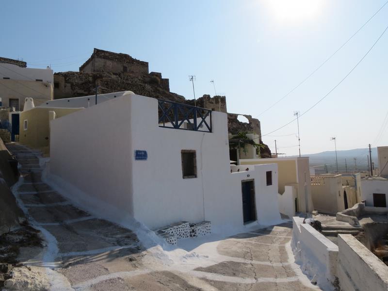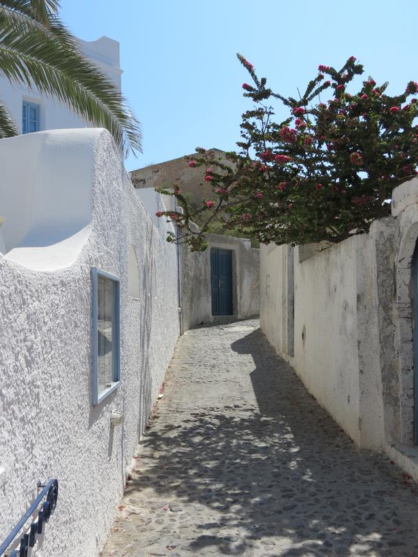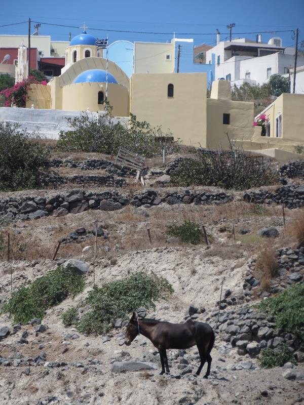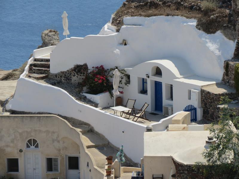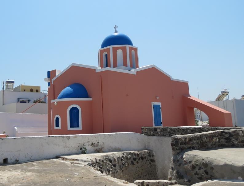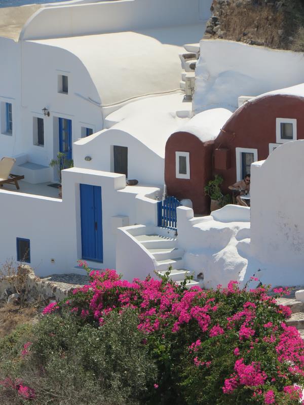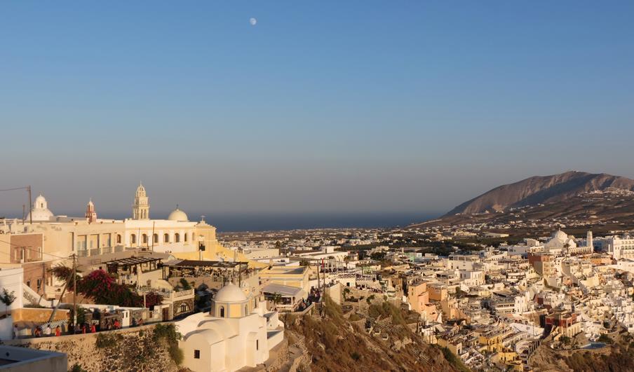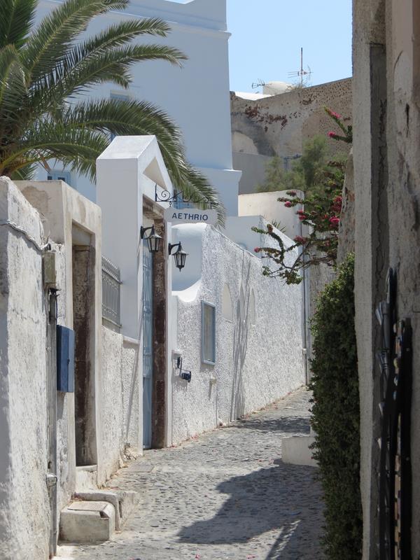 Arrivée à l'île de Santorin La tour Eiffel de la Grèce !!! Santorin offre l'un des spectacles naturels les plus saisissants de la Méditerranée : imaginez une île/volcan dont le cratère s'est totalement effondré ne laissant à la surface de l'eau qu'une partie de la ceinture du volcan, quelques îlots et au centre de tout ça une petite île faite de lave d'où sortent des sources chaudes formant ainsi la Caldeira. C'est étrange cela veut dire "chaudière" en portugais ... Santorin offre l'image d'une longue falaise en à-pic de 80 à 120 m de haut, où se superposent des couches géologiques de cendres noires ou rouges, avec des villages blancs perchés aux sommets. C'est magnifique !