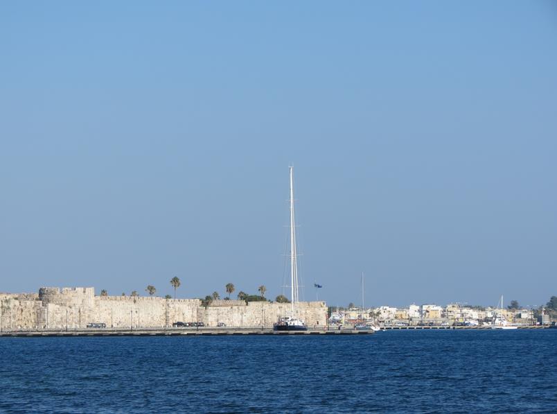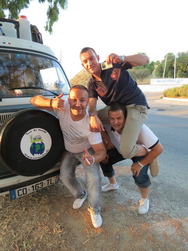 Nous reprenons un ferry pour aller à l'île de Kos Dès notre sortie de bateau vers 6h du matin nous voyons notre route barrée par 3 énergumènes. Il s'agit de 3 français "légèrement" éméchés incapables de retourner à leur hôtel !!! Nous les ramenons donc à leur club de vacances. Pour nous remercier ils nous invitent à profiter de leur salle de bain et nous offrent même un petit déjeuner gratis au bord de la piscine !!!!