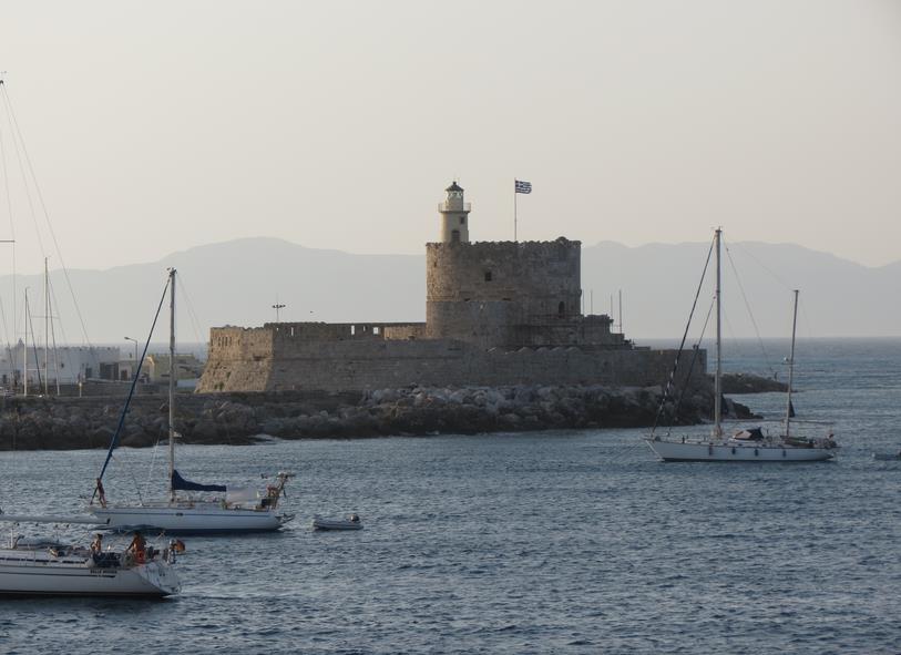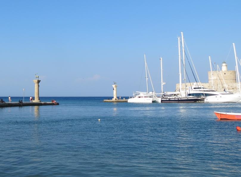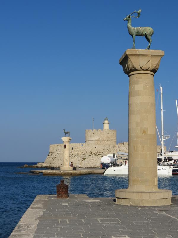 Le colosse de Rhodes, l'une des sept merveilles du monde, était une statue gigantesque, traditionnellement située à l'entrée du port de la ville de Rhodes, à l'emplacement des 2 colonnes actuelles surmontées de biches, et destinée à effrayer les éventuels assaillants.