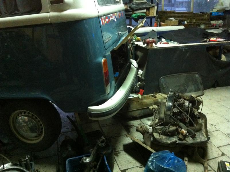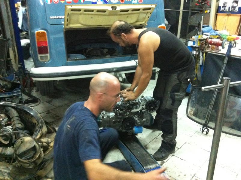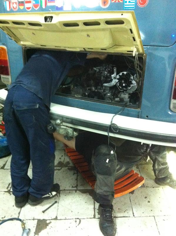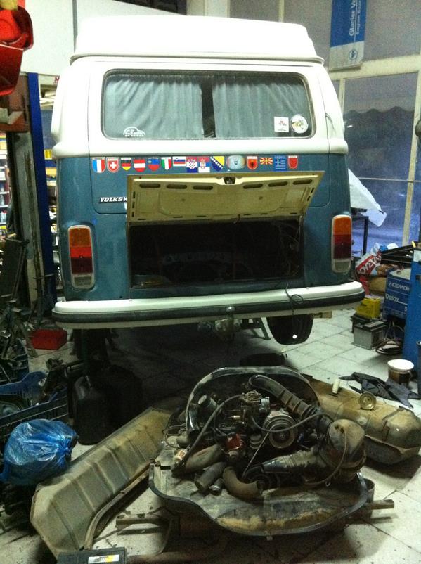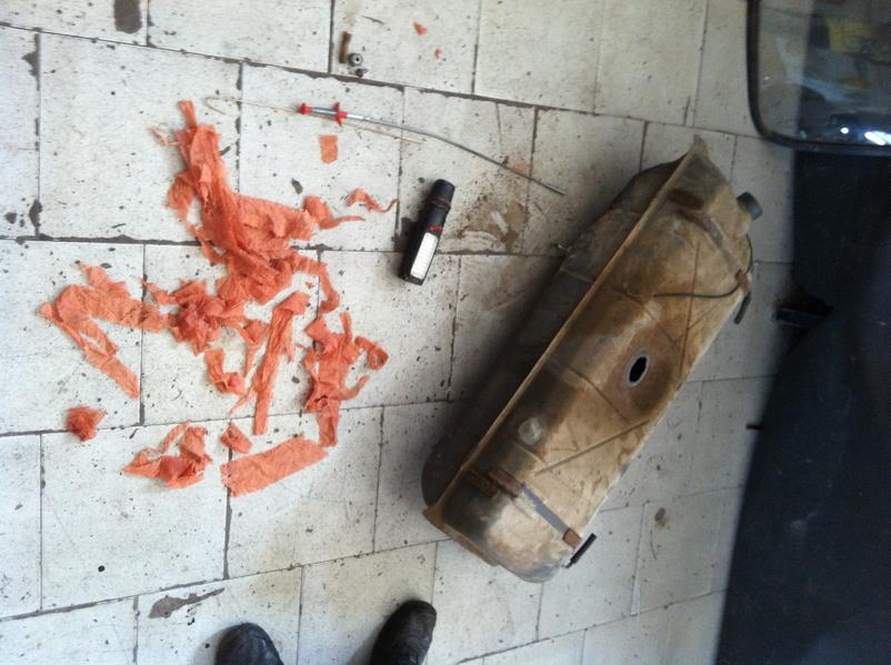 Fatigués des côtes montées en première à 20 à l'heure et d'une consommation atteignant parfois les 18L/100kms, nous décidons de faire changer le moteur de Caracolito pour un moteur plus puissant et moins gourmand. Tout naturellement nous retournons voir notre ami Andréas qui en profite pour sortir le réservoir et SURPRISE SURPRISE... il y a plein de papier à l'intérieur... D'où vient-il ? Sabotage ? Oubli lors de la préparation du véhicule ?? Mystère. Mais maintenant nous avons l'explication au fait que depuis le départ nous avons de gros problèmes de carburation, gicleur bouché et consommation d'un grand nombre de filtres à essence.