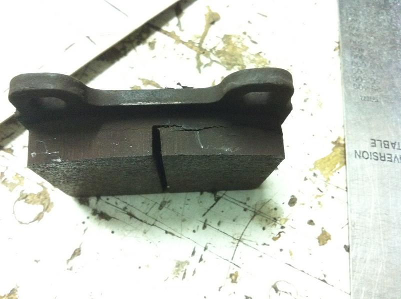 Andréas en profite pour tout vérifier et nous ne sommes pas à la fin de nos surprises : PLAQUETTES DE FREIN FENDUES !!!! (évitez les plaquettes de fabrication chinoise - voir photo) ROULEMENTS ARRIERE MORTS 2 AMORTISSEURS ARRIERE DE TAILLES DIFFERENTES etc .... Au vu de toutes ces surprises nous demandons à Andréas de contrôler un peu tout. Nous voulons repartir avec un véhicule fiable.