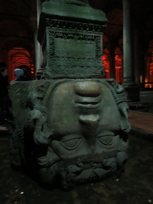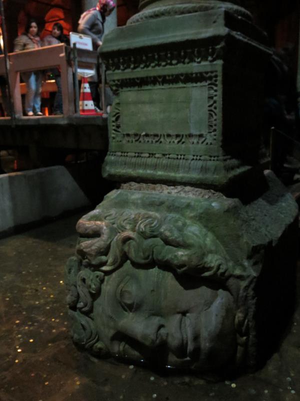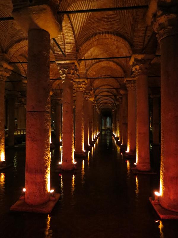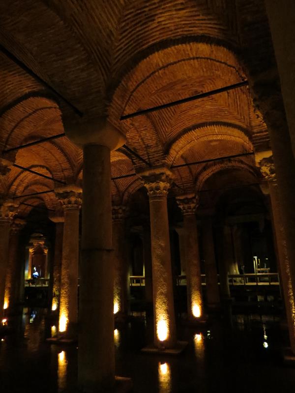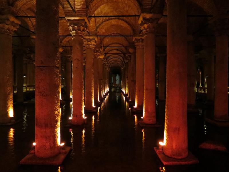 Yerebatan Sarayi : La Basilique "citerne" ou le "palais englouti" comme l'ont surnommé les Turcs L'un des monuments les plus fascinants du quartier Sultanhamet. Datant du 1er siècle de notre ère, longue de 140m, large de 70m, haute de 8m, possédant 336 colonnes réparties en 12 rangées de 28 et d'une capacité de 100 000 litres, elle fut utilisée pour alimenter en eau les palais byzantins, puis le Palais Topkapi. Il y a quelques années il était possible de la visiter en barque, ce que fit d'ailleurs James Bond dans "Bons baisers de Russie" en partie tourné à Istanbul