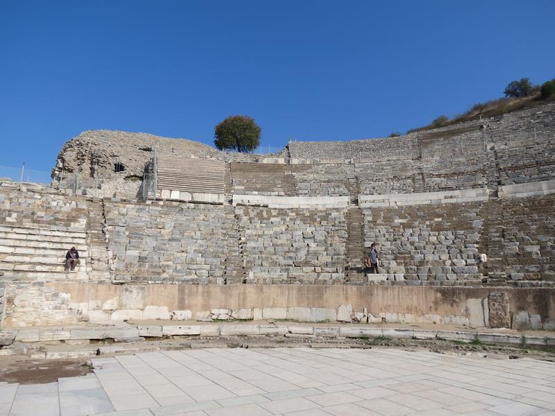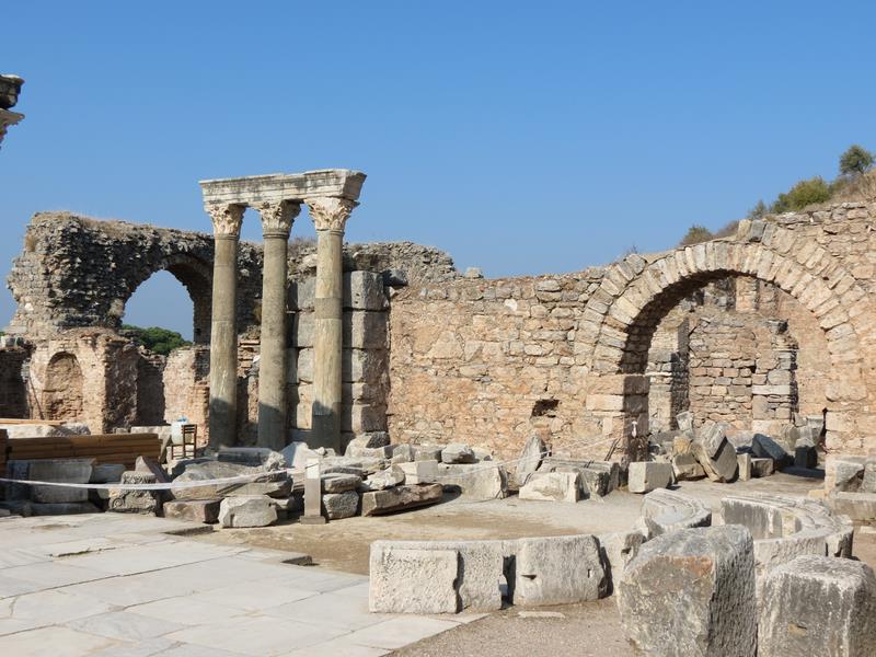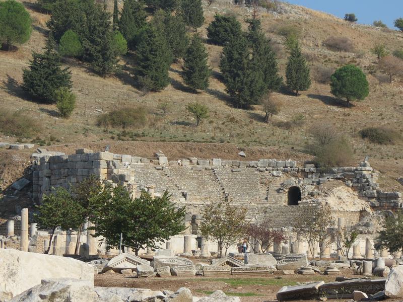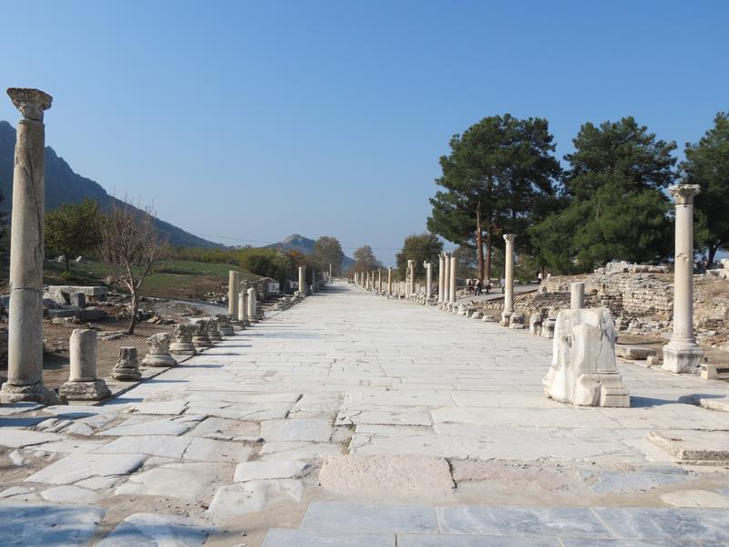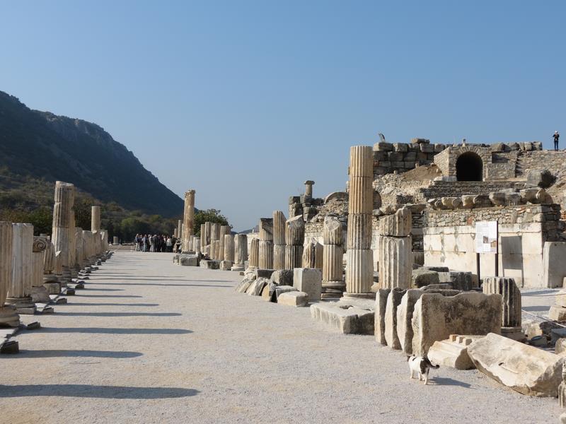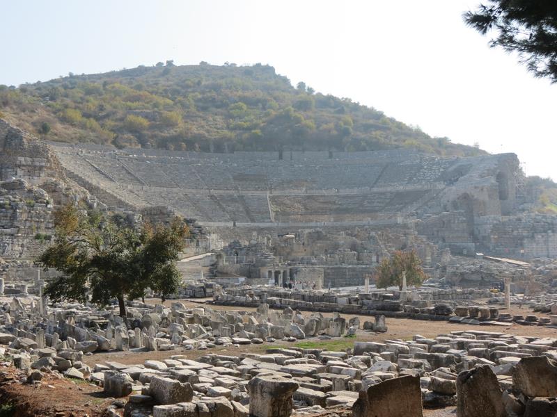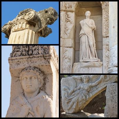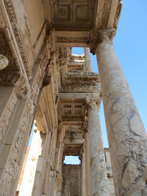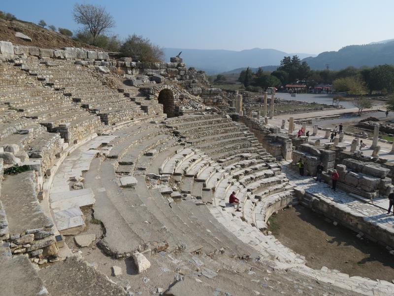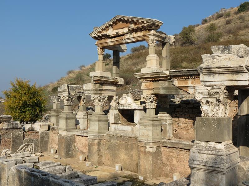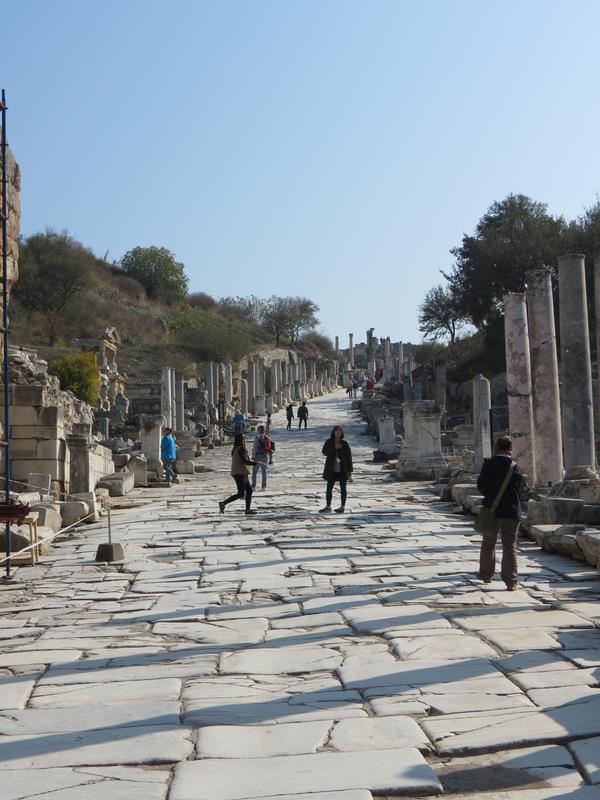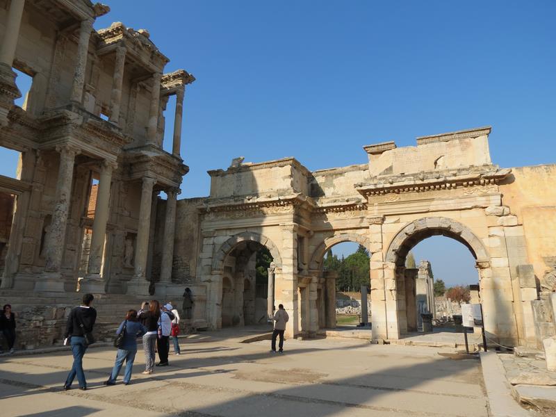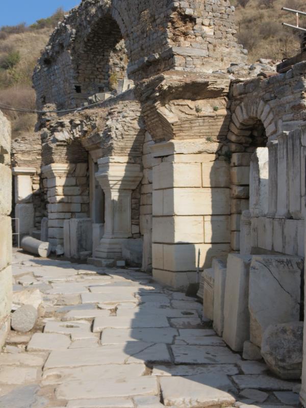 La cité d'Ephèse (3ème siècle av. JC) connut son apogée au 1er siècle de notre ère et fut l'un des ports les plus actifs de son époque avec Rome et Alexandrie. Elle compta jusqu'à 200000 habitants, mais confrontée à l'inexorable ensablement de son port (la mer se situe aujourd'hui à environ 10 kilomètres...), à une série de tremblements de terre et d'attaques ennemies, elle fut progressivement abandonnée au 4ème siècle. Ephèse possédait : un magnifique théâtre de 24000 places (où Saint Paul serait venu prêcher), une splendide bibliothèque, des latrines publiques, et même une maison close...