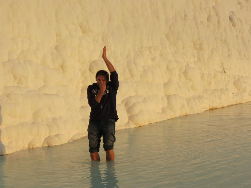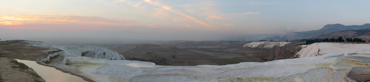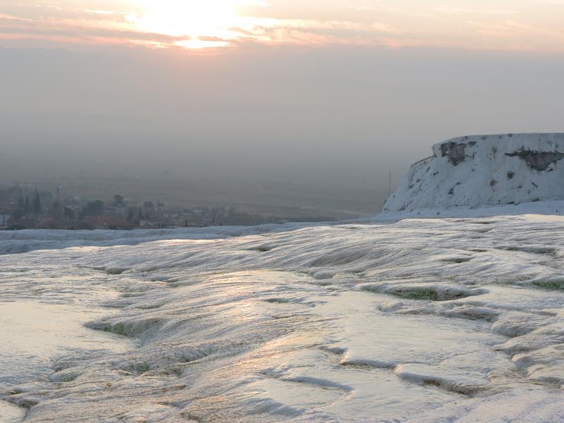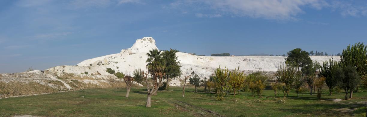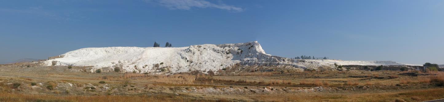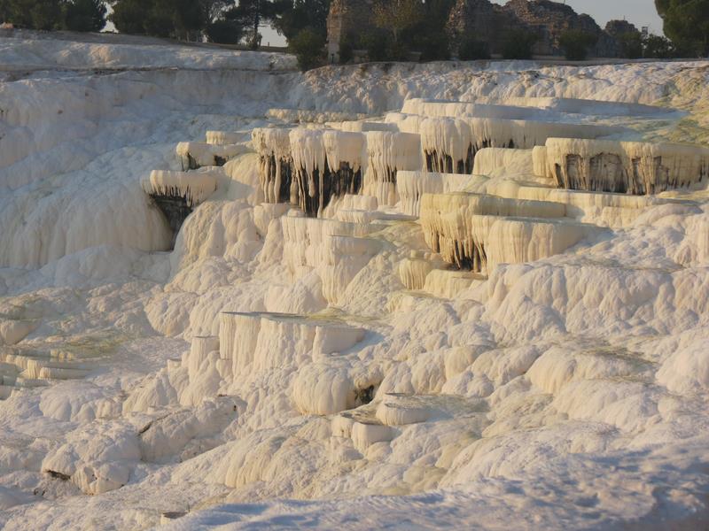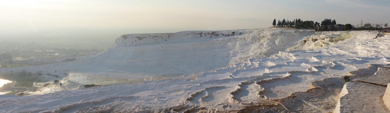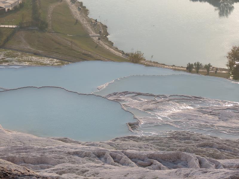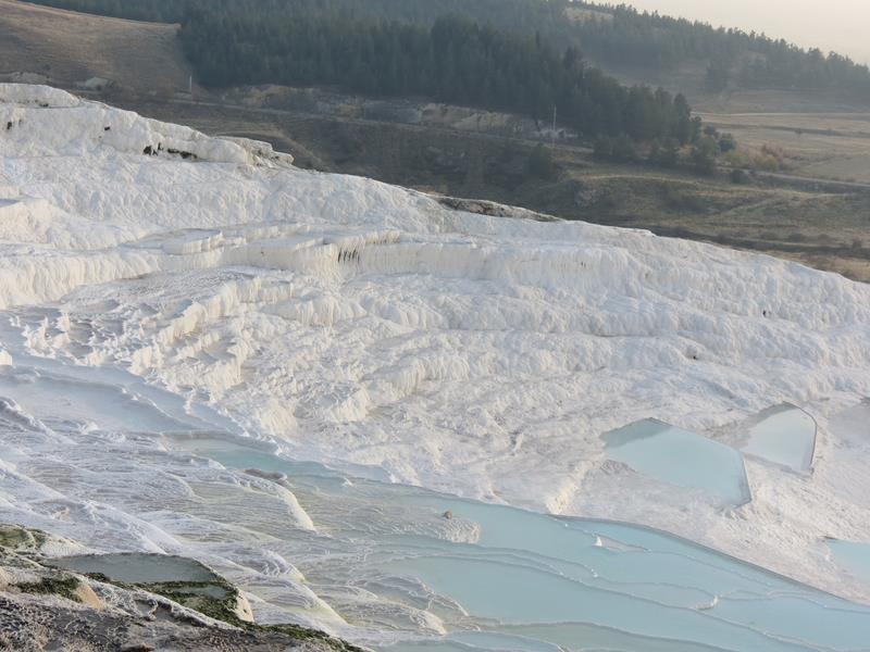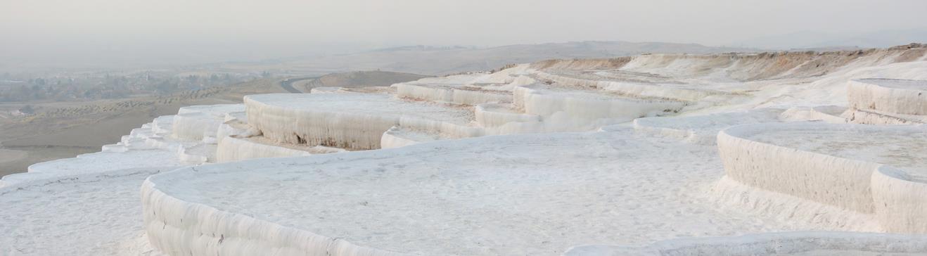 C'est un site réellement étonnant ! Dévalant d'une haute falaise, des sources chaudes (35° à 55°) chargées de sels calcaires, ont depuis des milliers d'années, modelé la montagne en une cascade de bassins naturels d'une blancheur éblouissante. La roche porte le nom de "travertin".